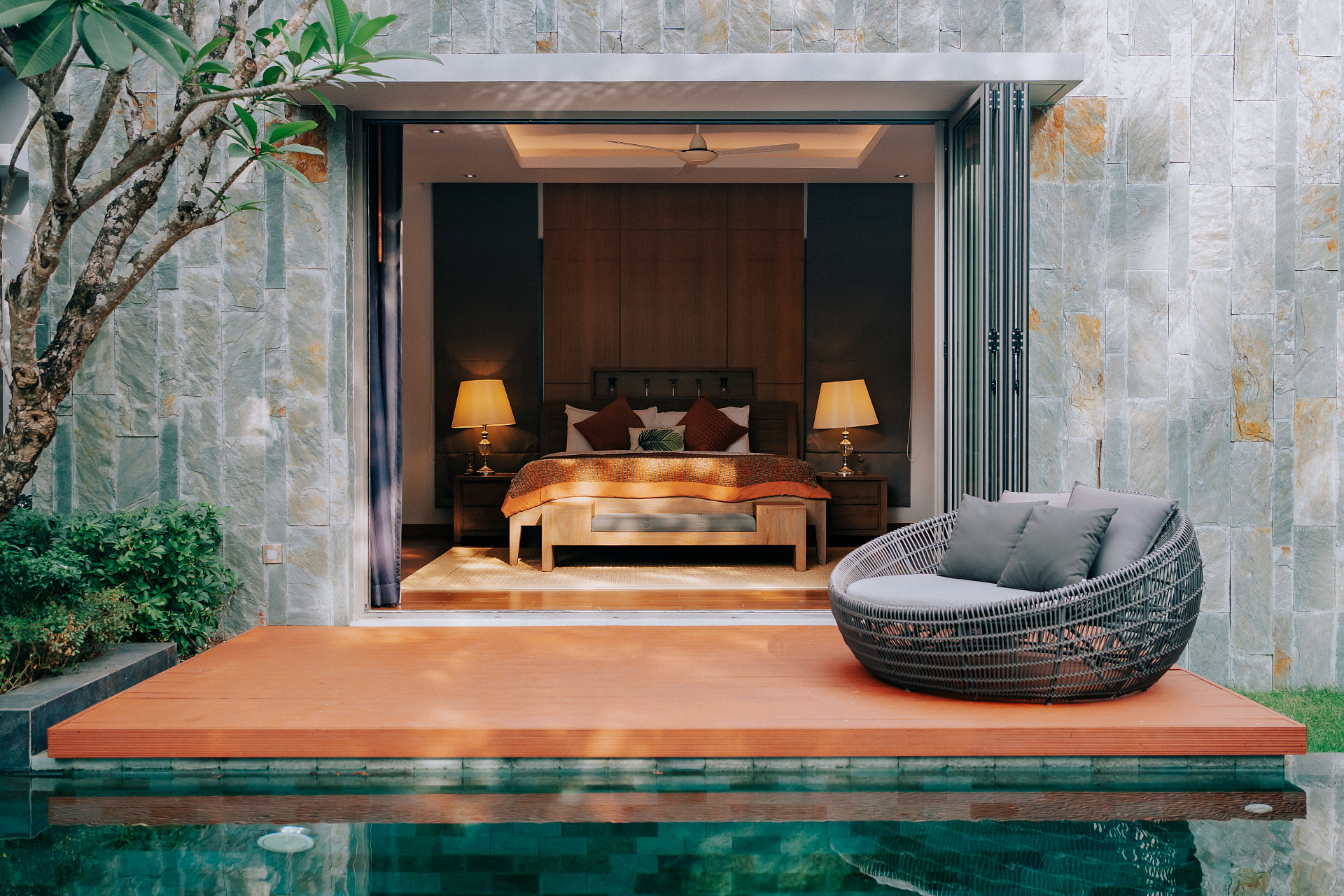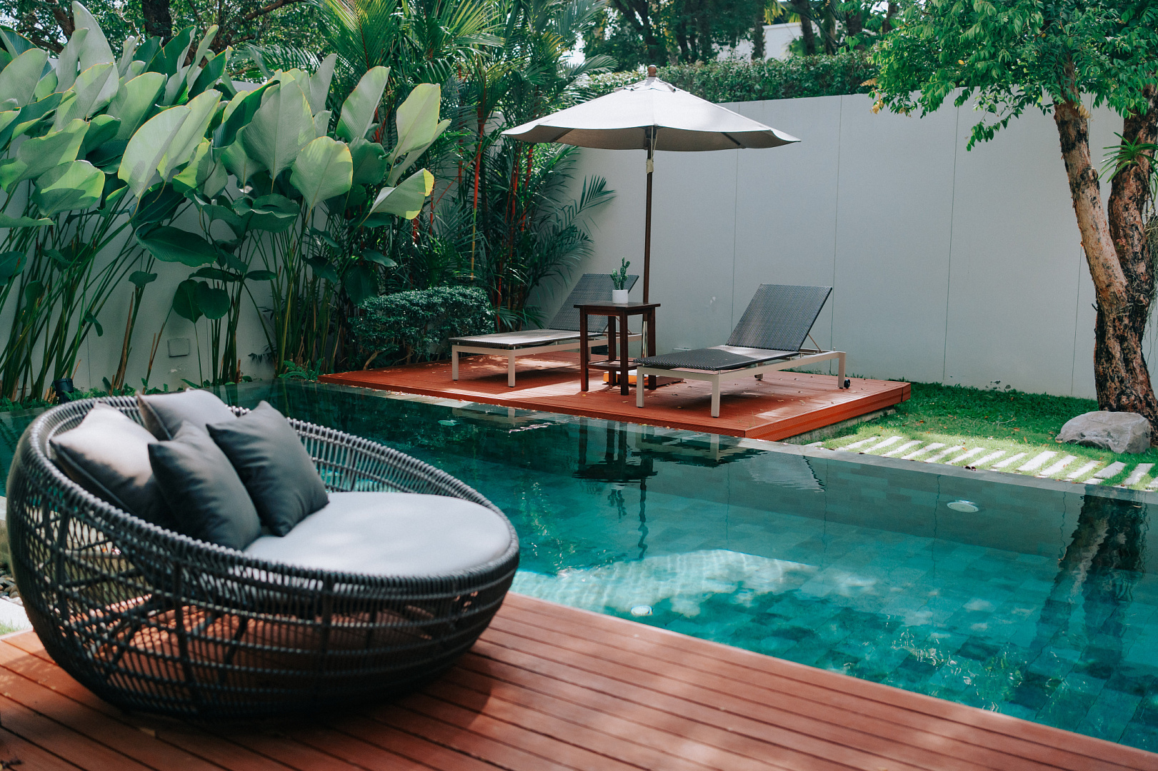 Из мастер-спальни открывается выход прямо к бассейну на небольшую террасу с уютной ротанговой кроватью. Здесь приятно начинать утро с освежающего купания, а днем - устроиться с книгой, понежиться на солнце и подарить себе моменты полного отдыха и загара.