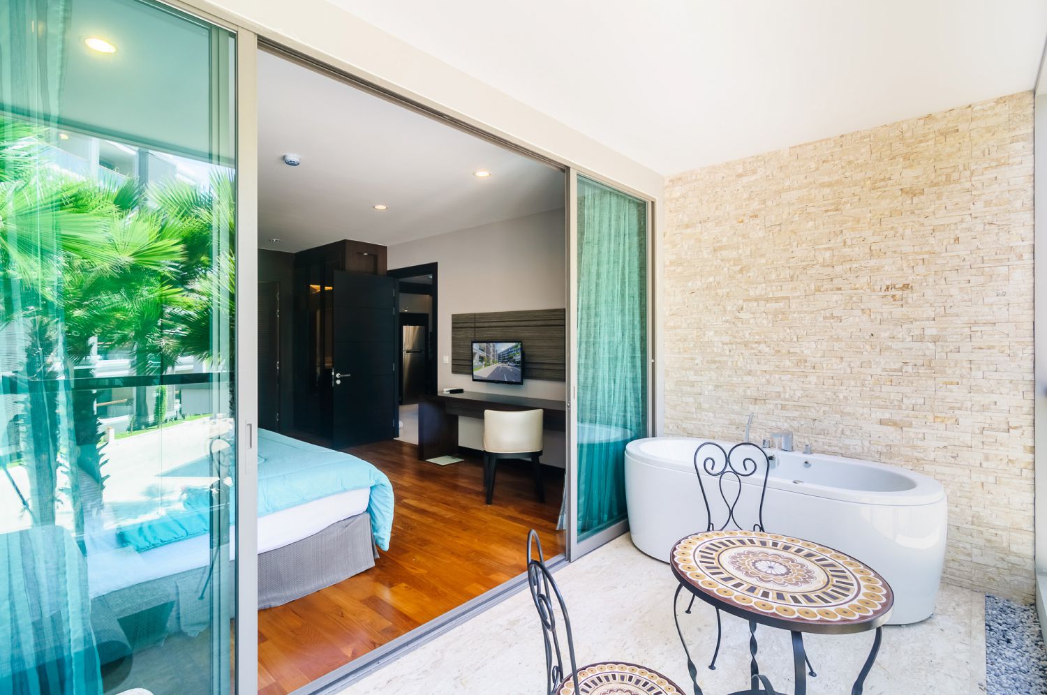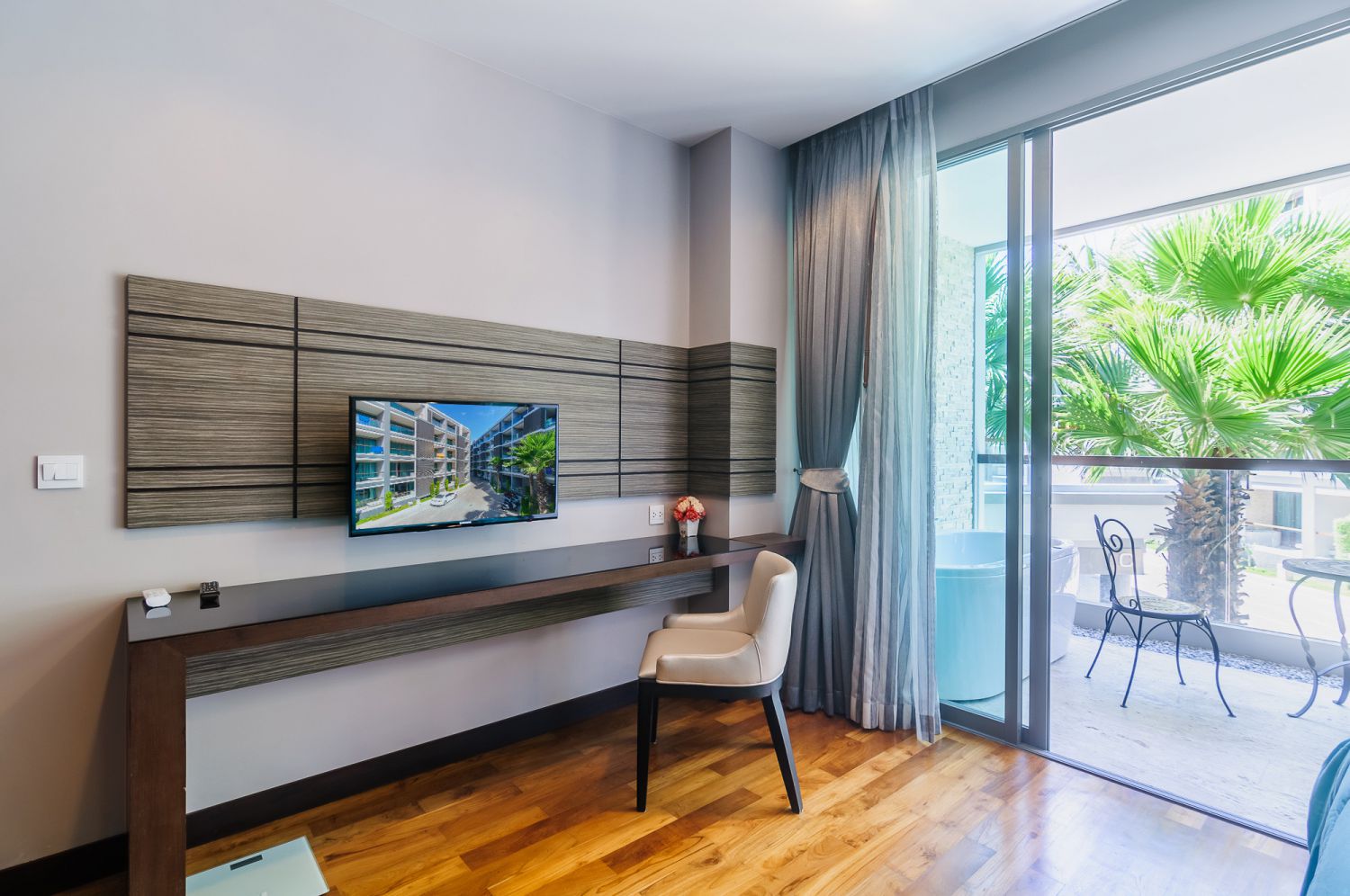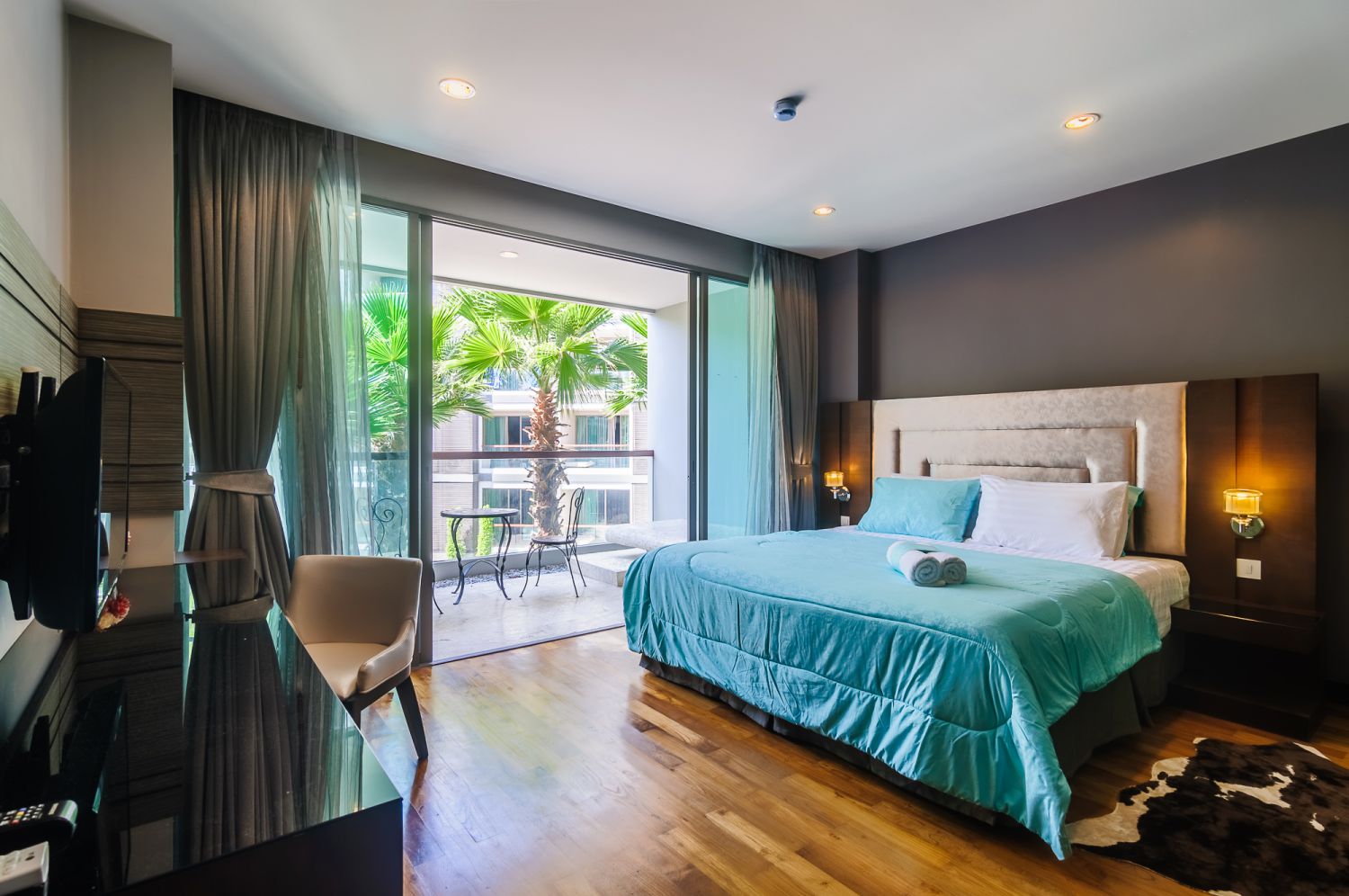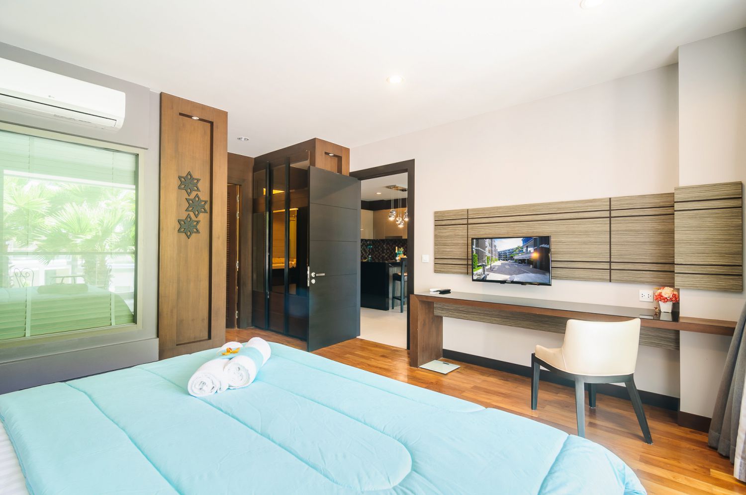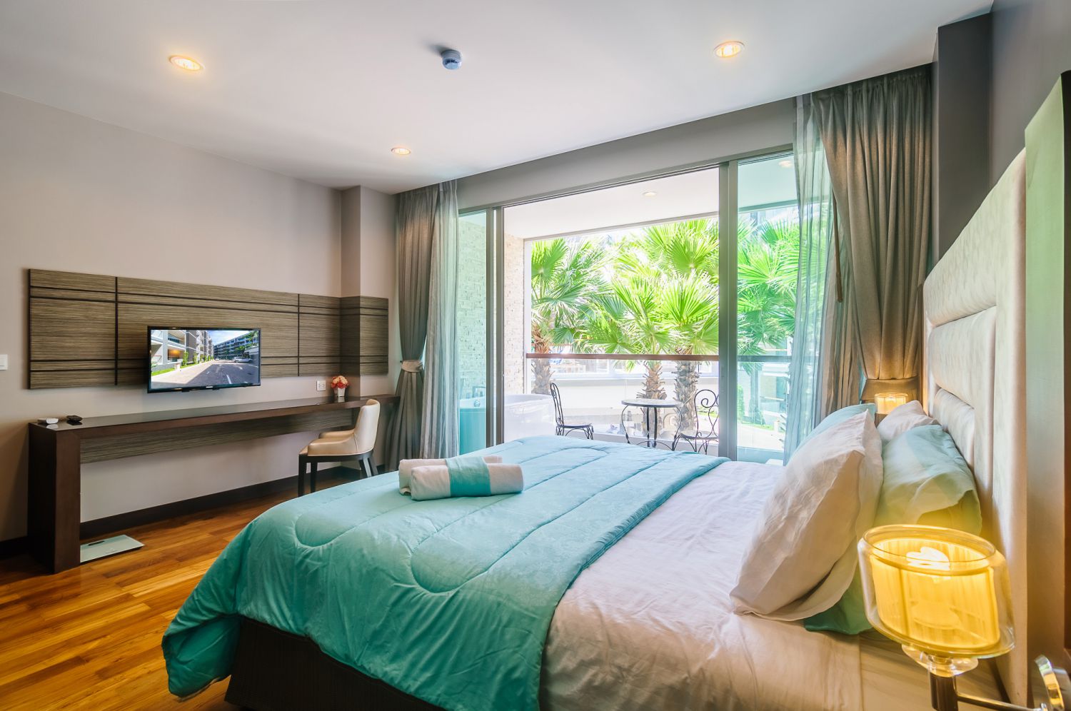 В спальне — комфортная двуспальная кровать и качественное постельное белье. Балкон с уличной мебелью — идеальное место для утреннего кофе или вечернего бокала вина. Апартаменты оснащены кондиционером, быстрым Wi-Fi и умной TV-системой.