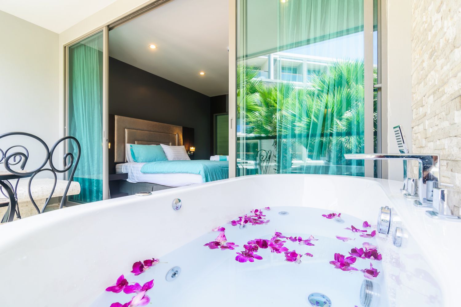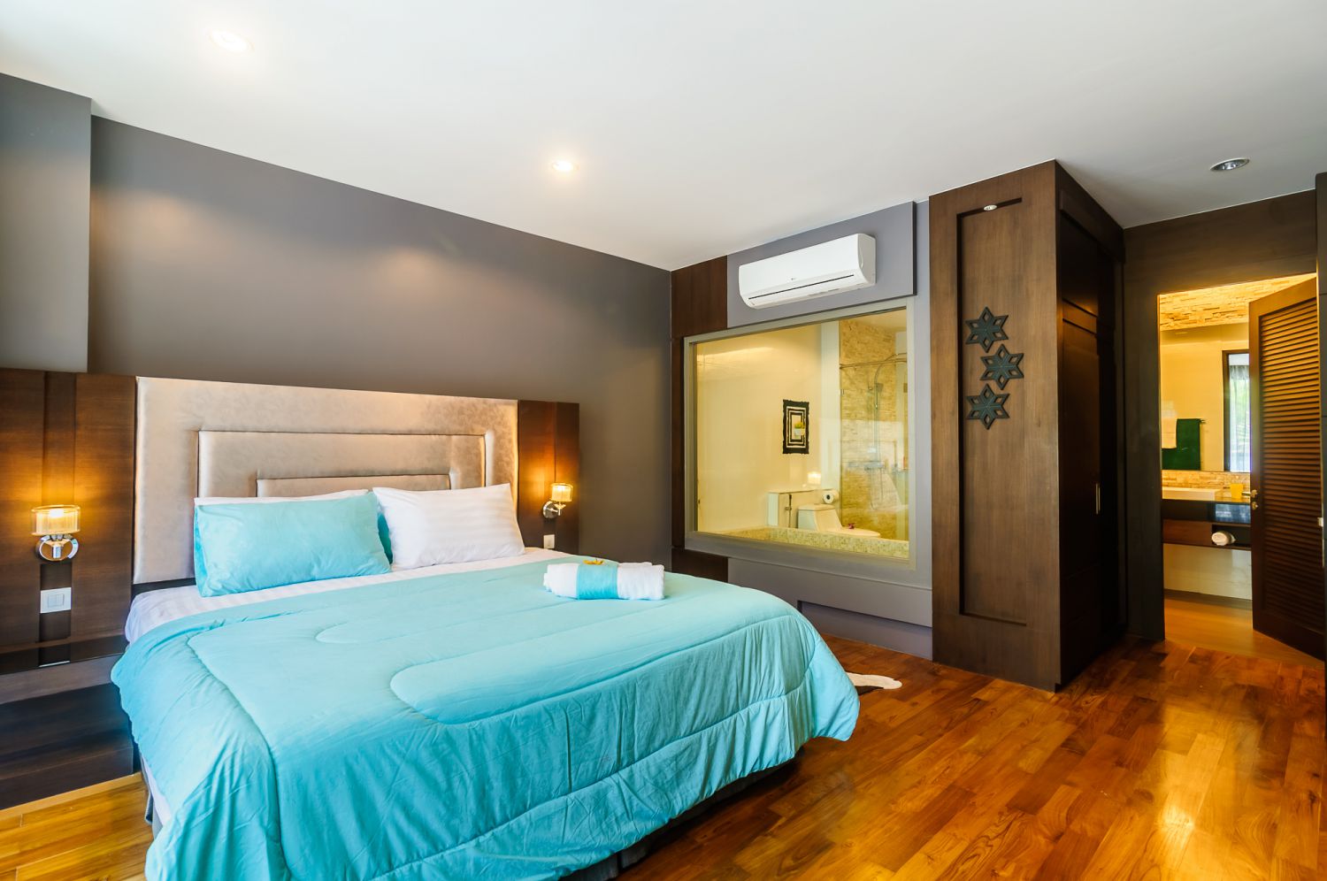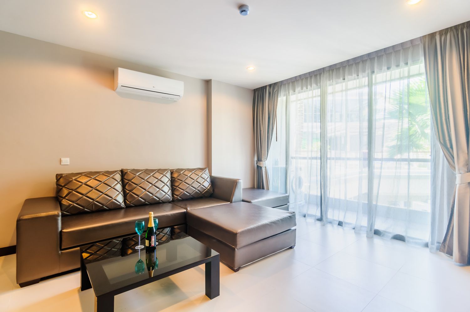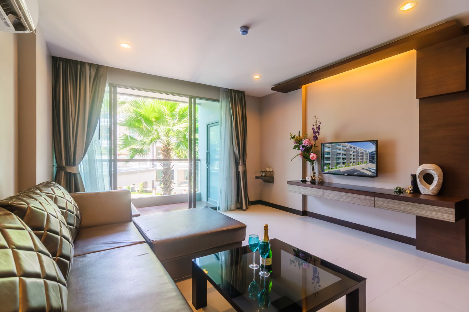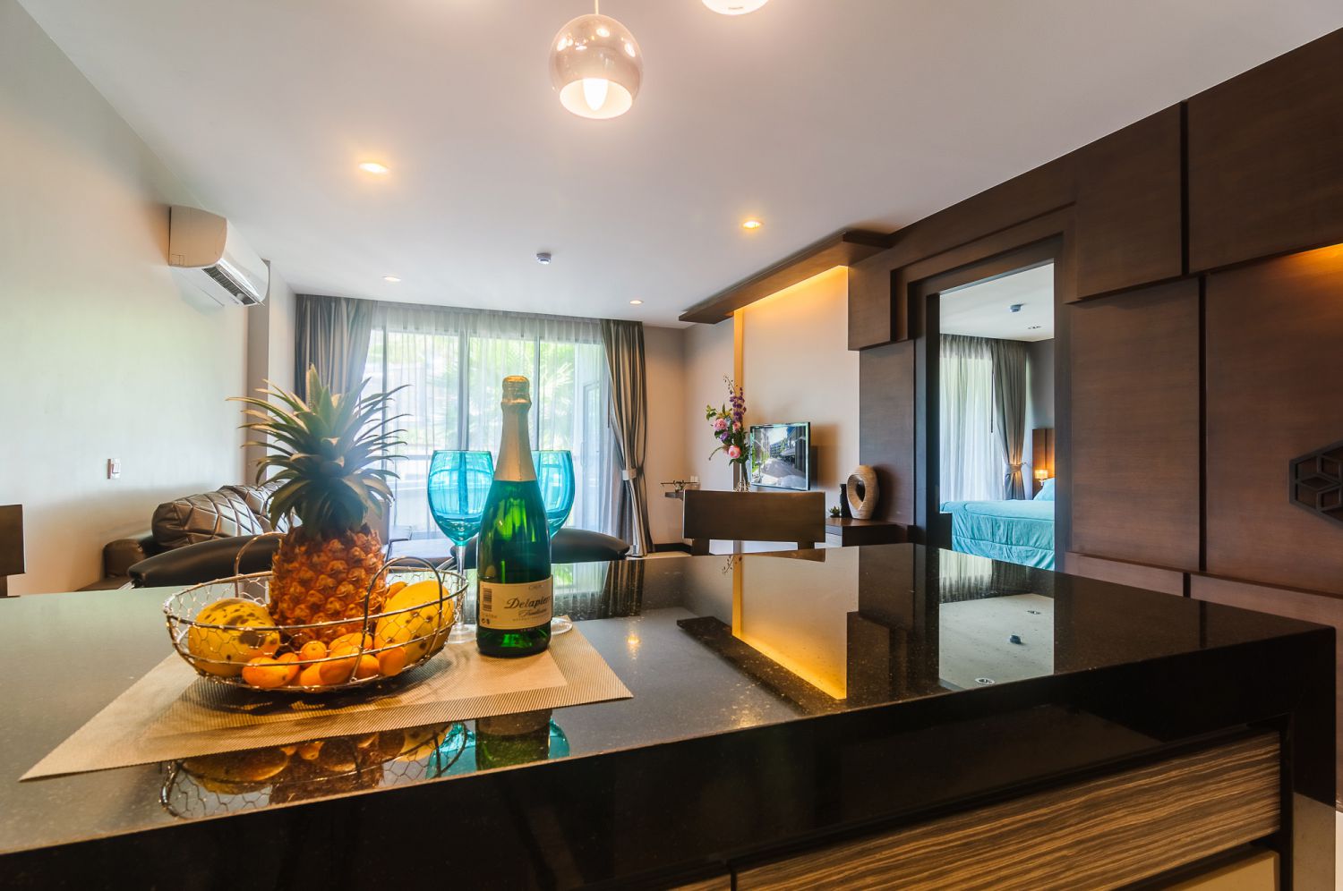 В спальне — комфортная двуспальная кровать и качественное постельное белье. Балкон с уличной мебелью — идеальное место для утреннего кофе или вечернего бокала вина. Апартаменты оснащены кондиционером, быстрым Wi-Fi и умной TV-системой.