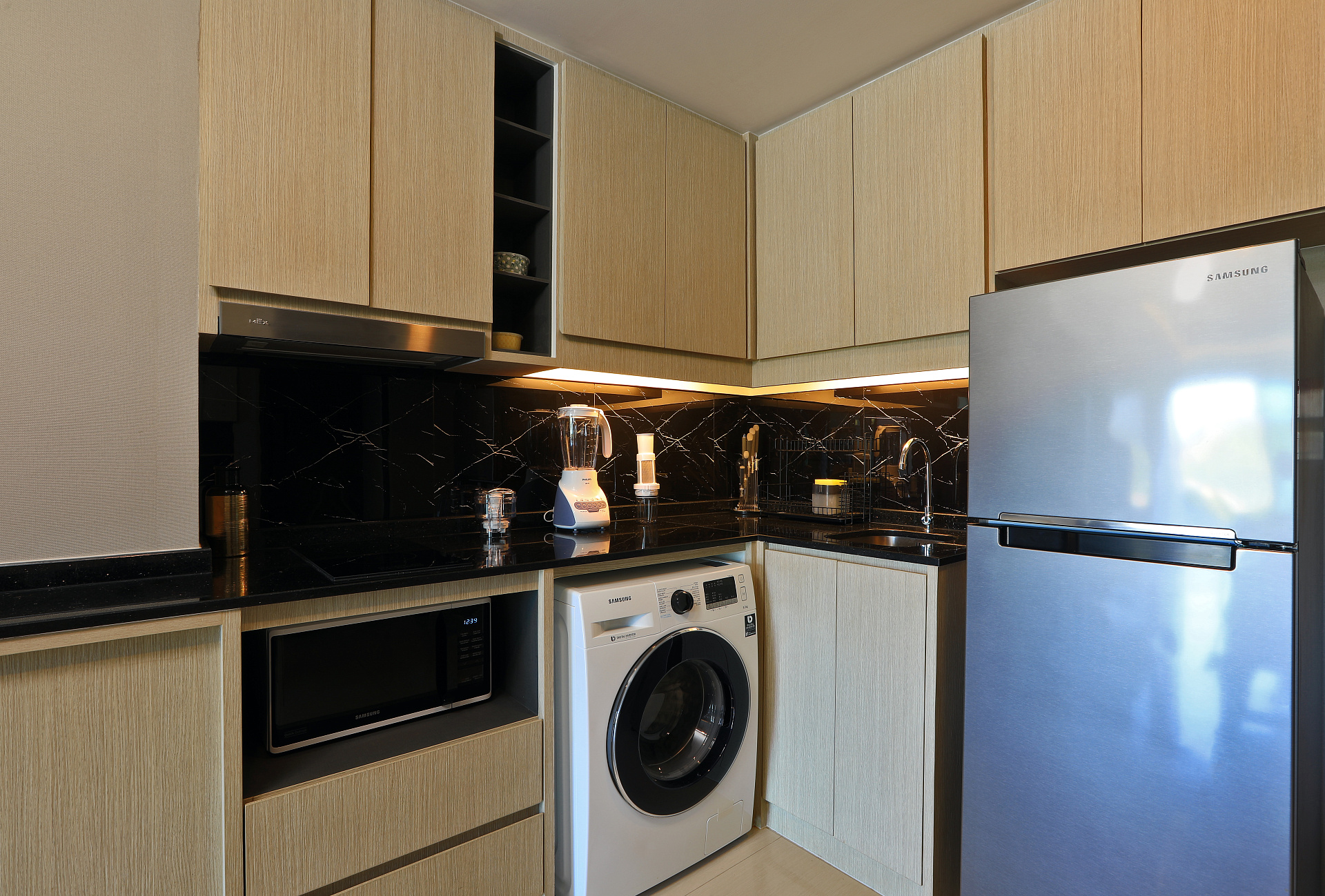 ● Кухонная техника: вытяжка, холодильник, электрическая плита, микроволновая печь, тостер, чайник, блендер, мультиварка, полный набор посуды