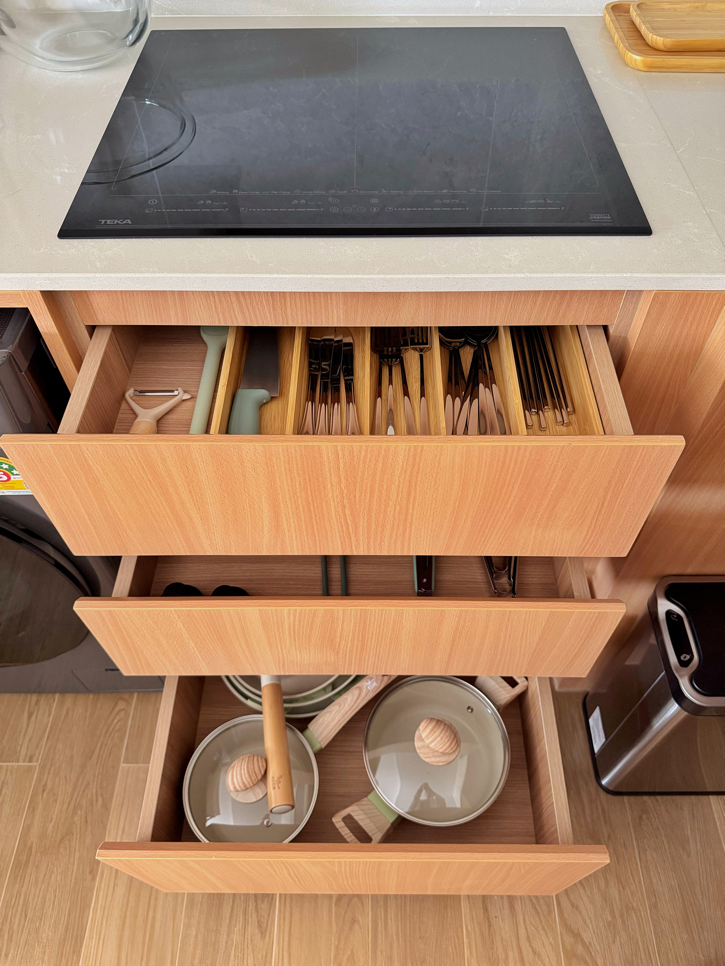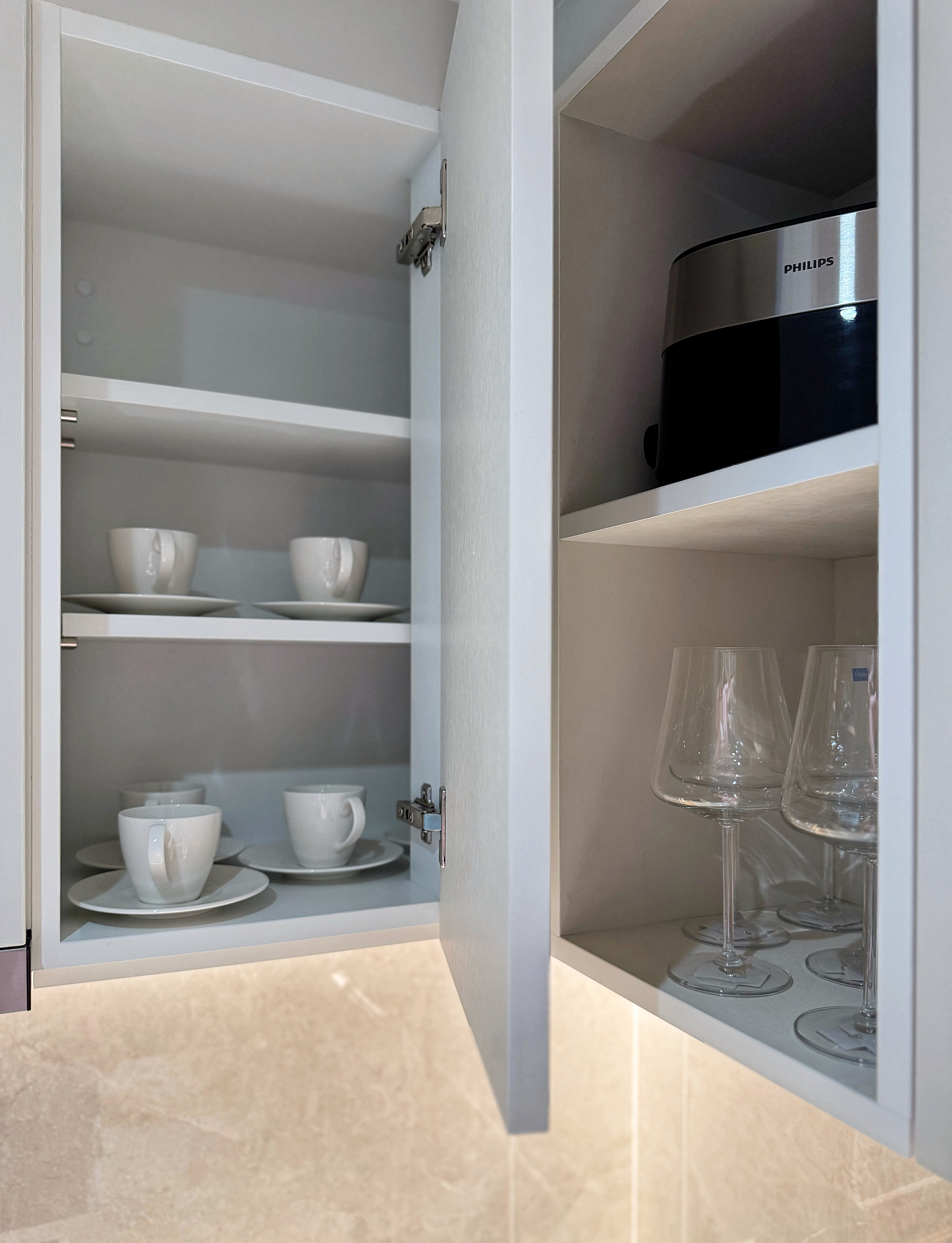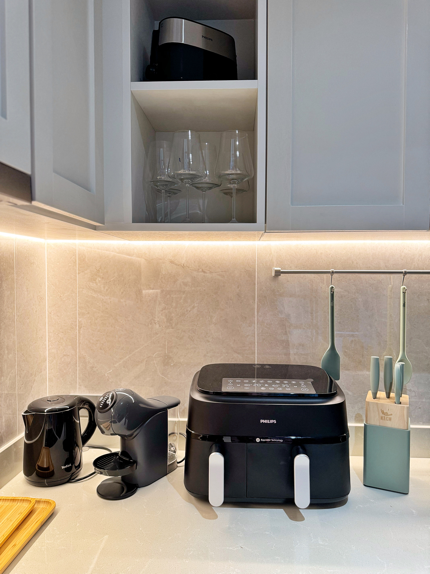 - просторная гостиная с обеденной зоной, большим угловым-диваном, ТВ и полностью оборудованной кухней включая аэрогриль-фритюрницу Philips с двумя отдельными отсеками, благодаря которым можно жарить, запекать или тушить одновременно разные блюда для изысканных обедов и ужинов.