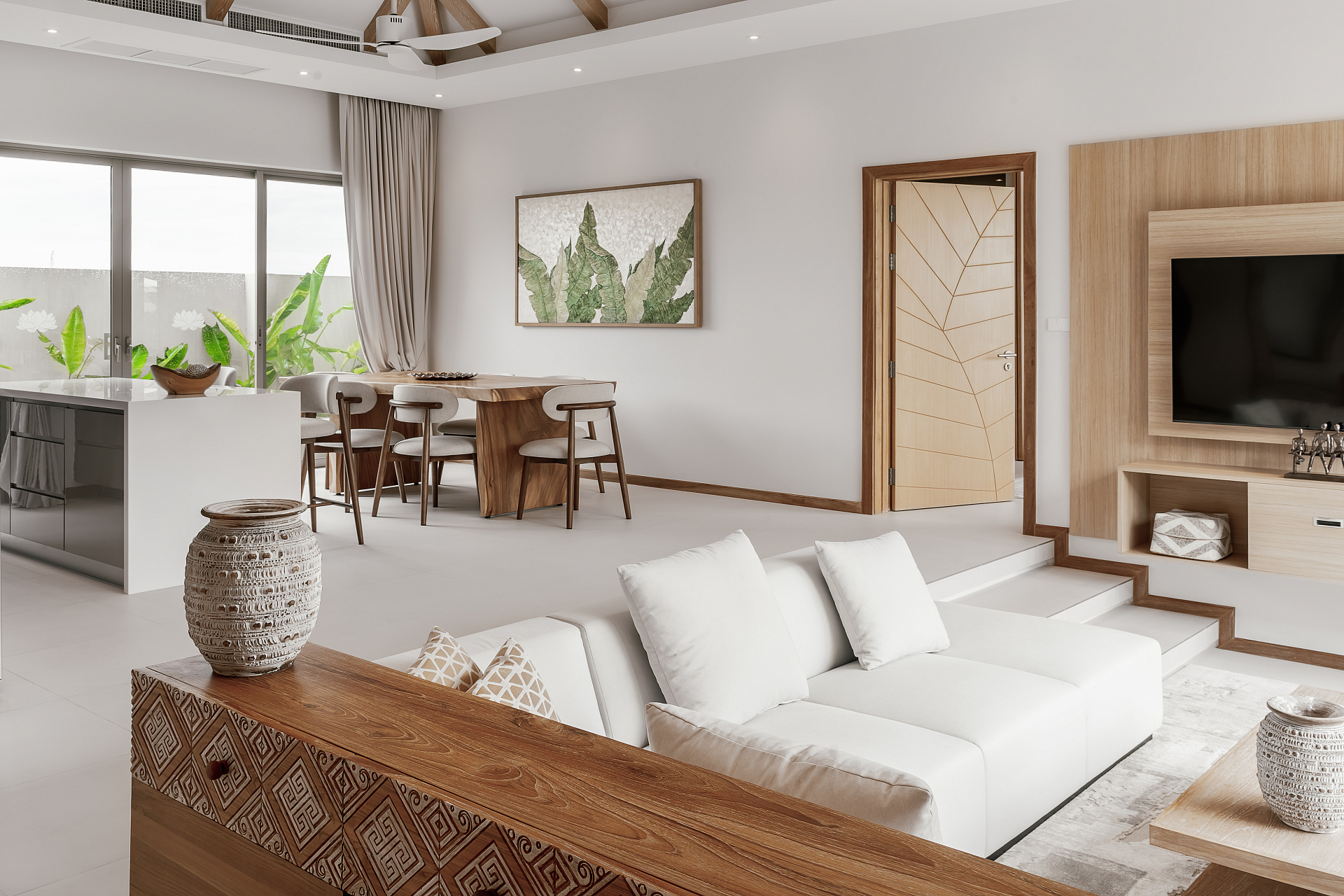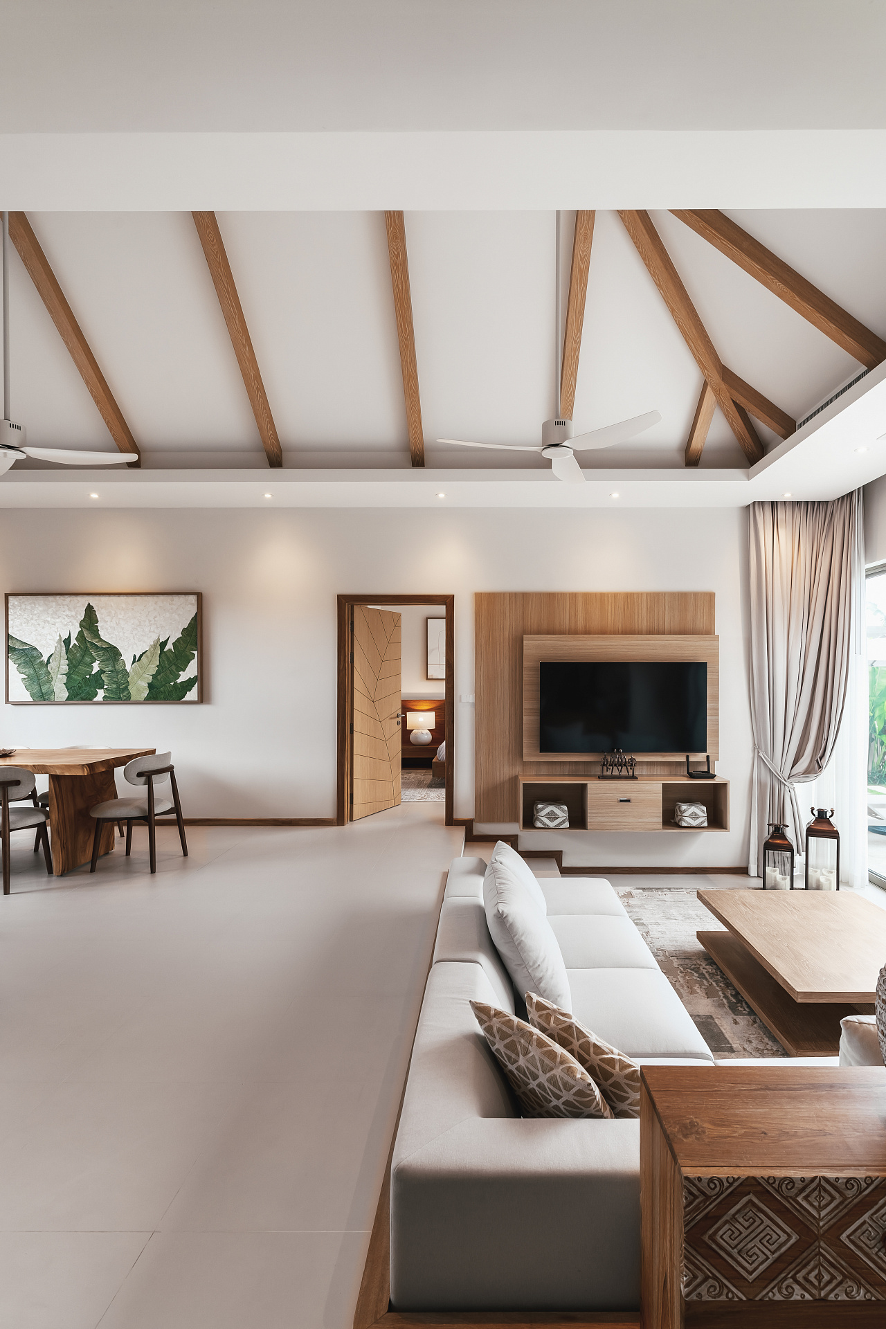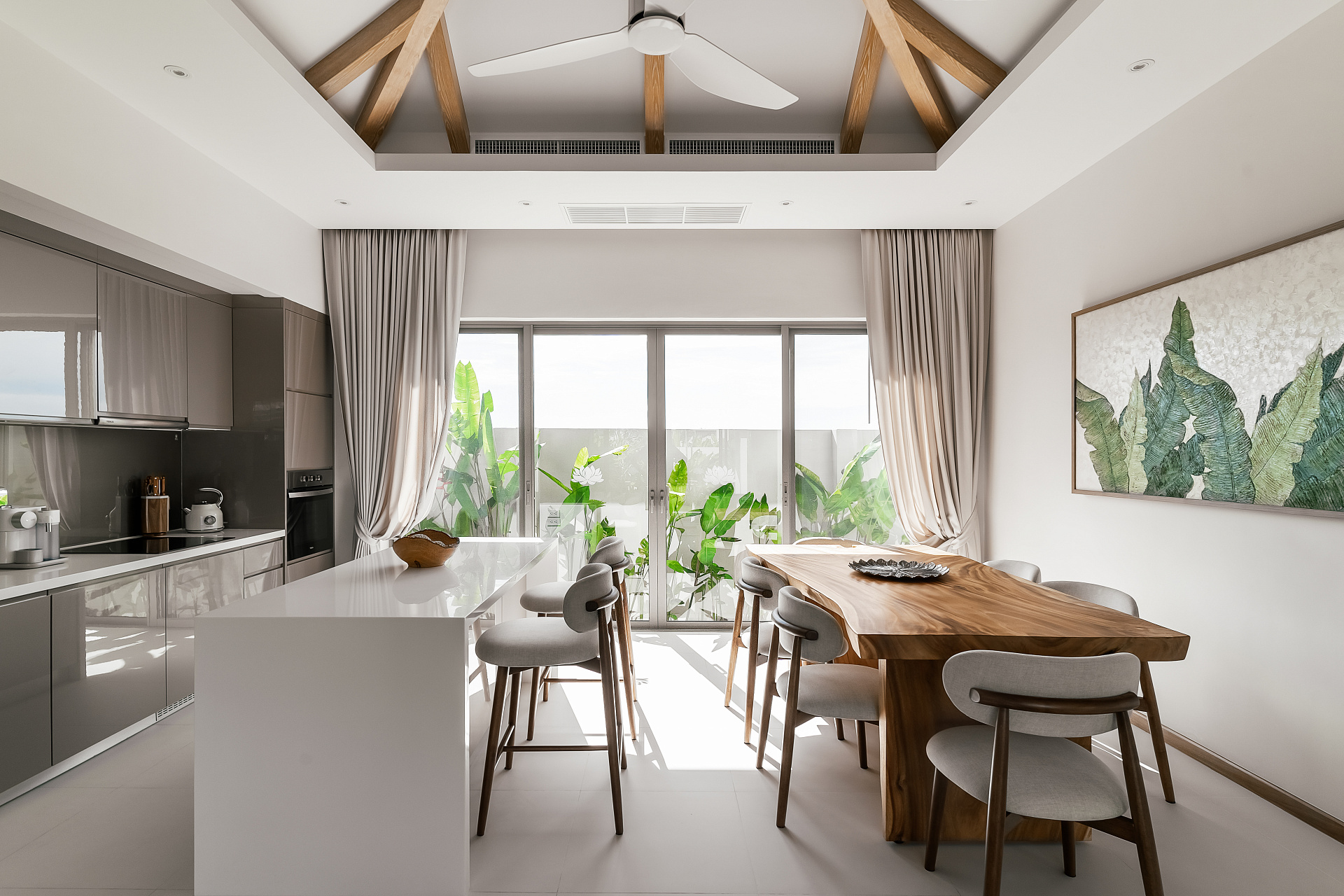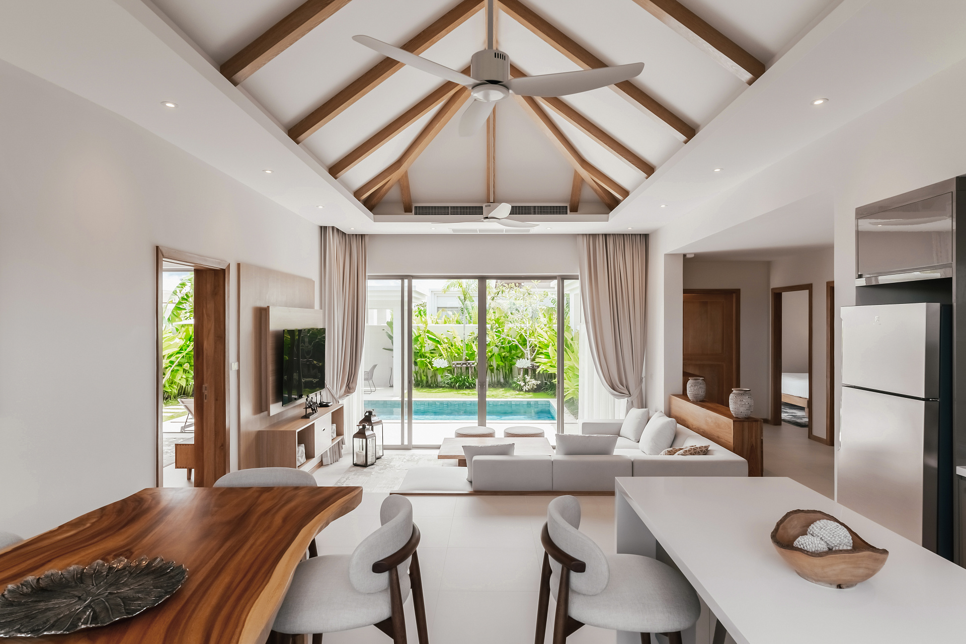 Скатные крыши над основными жилыми помещениями подчеркивают тропический образ жизни. Дизайн виллы выполнен в светлых тонах. Панорамные окна в пол открывают восхитительный вид на бассейн с бирюзовой балийской плиткой.
