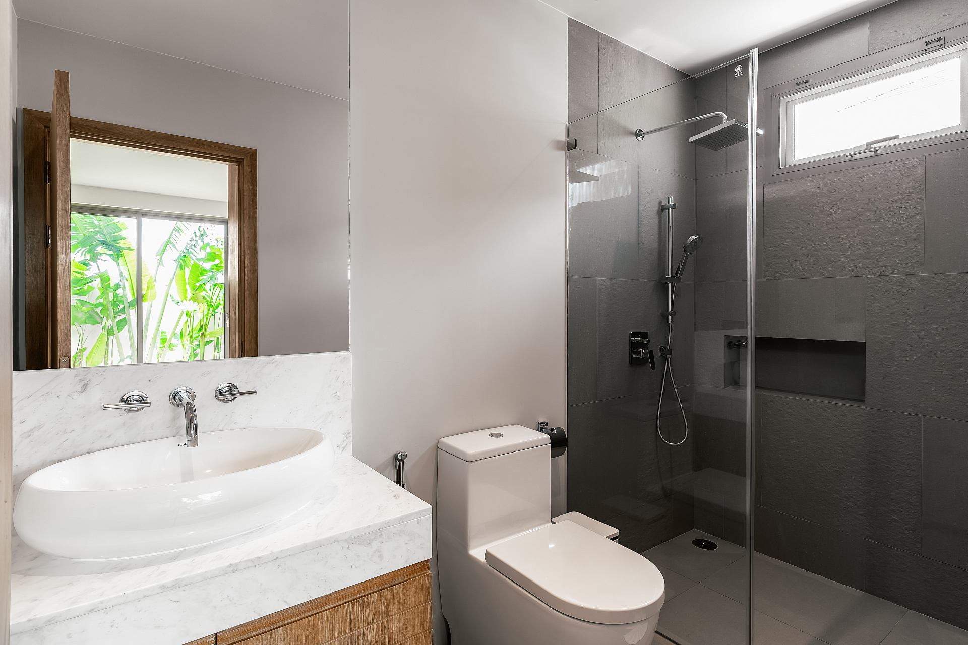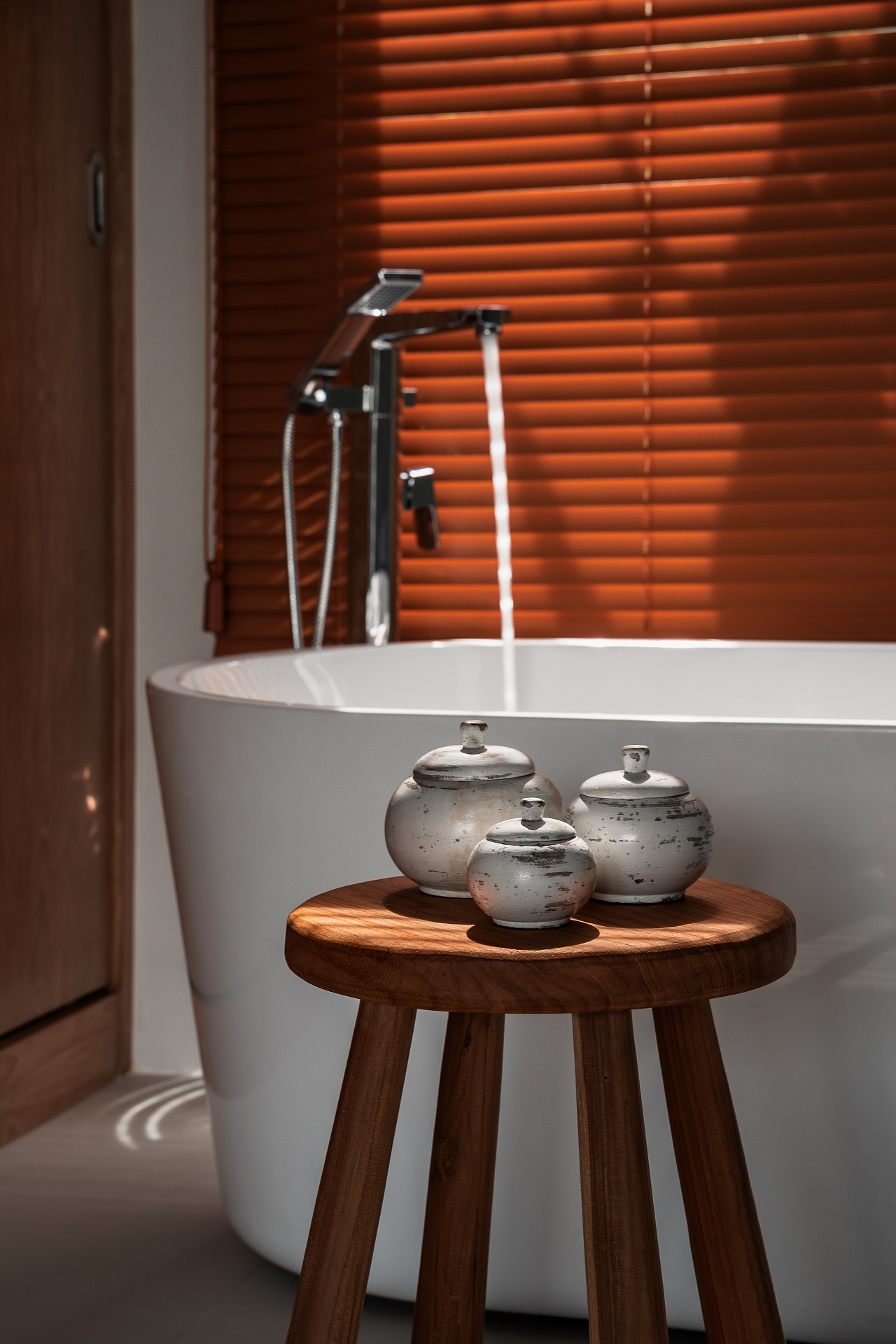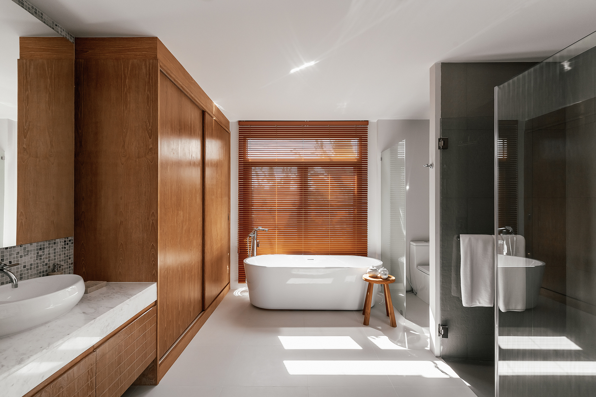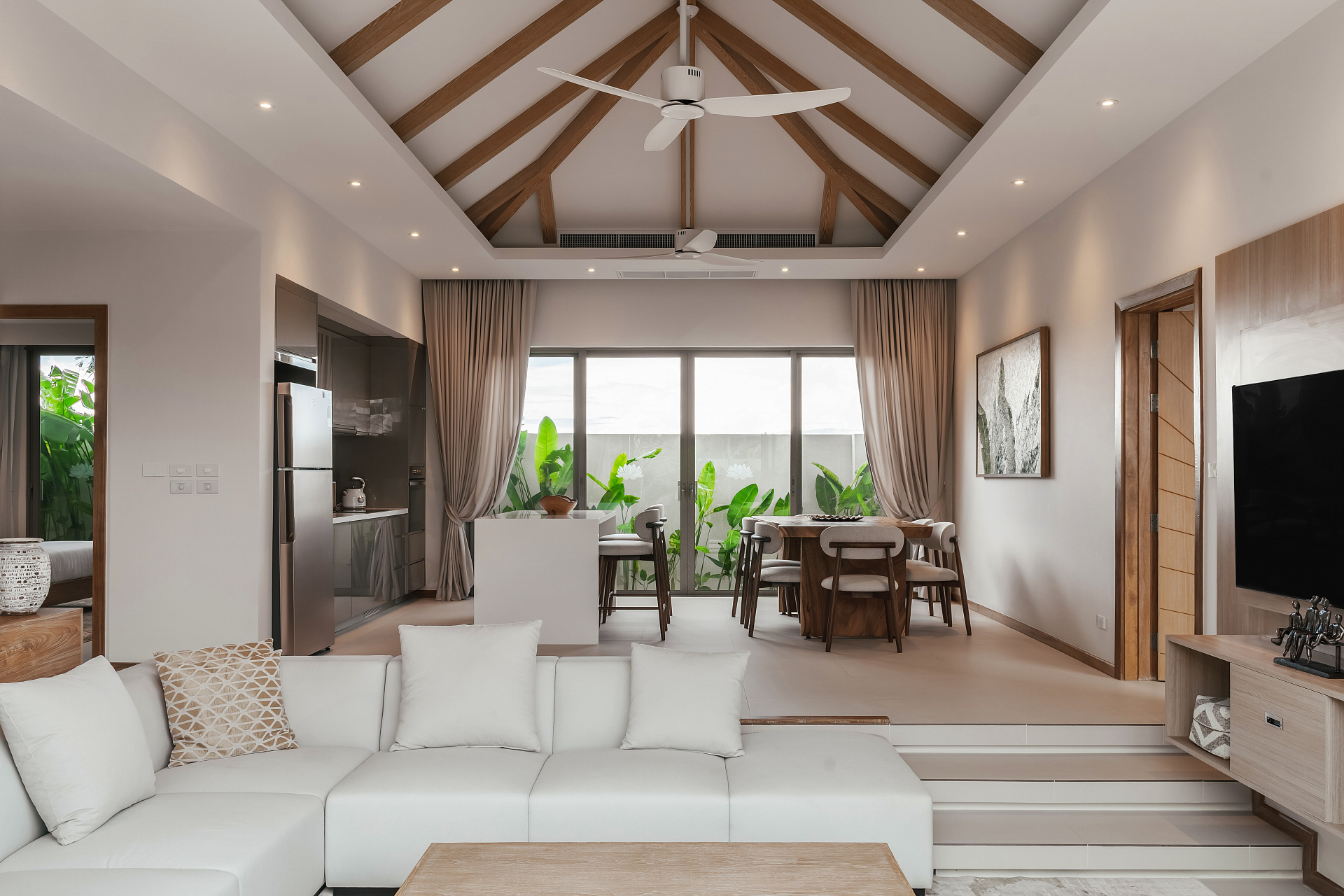 Скатные крыши над основными жилыми помещениями подчеркивают тропический образ жизни. Дизайн виллы выполнен в светлых тонах. Панорамные окна в пол открывают восхитительный вид на бассейн с бирюзовой балийской плиткой.