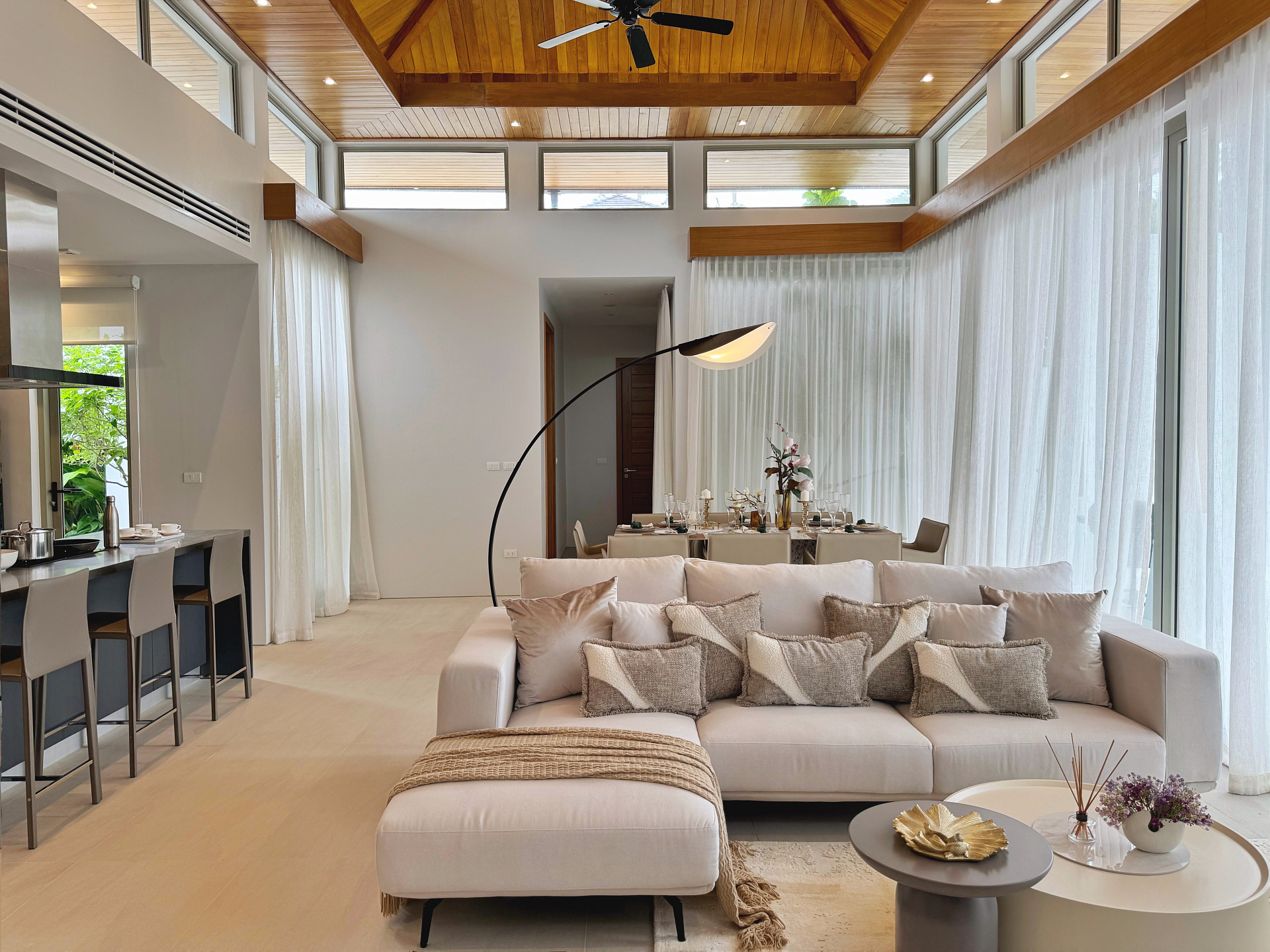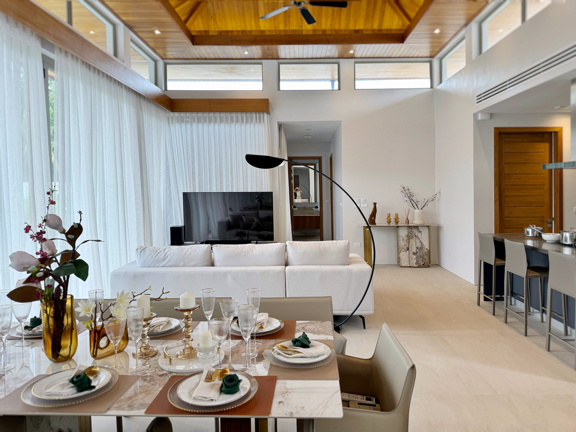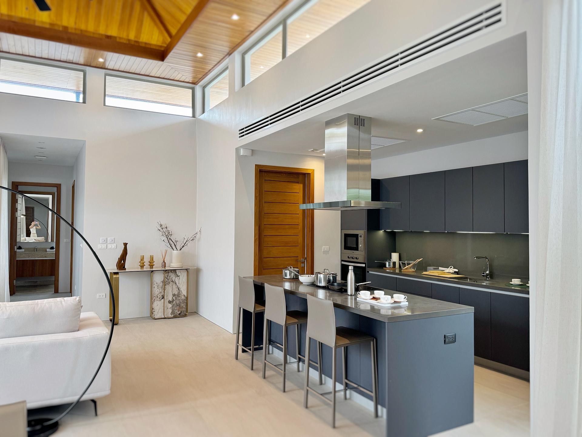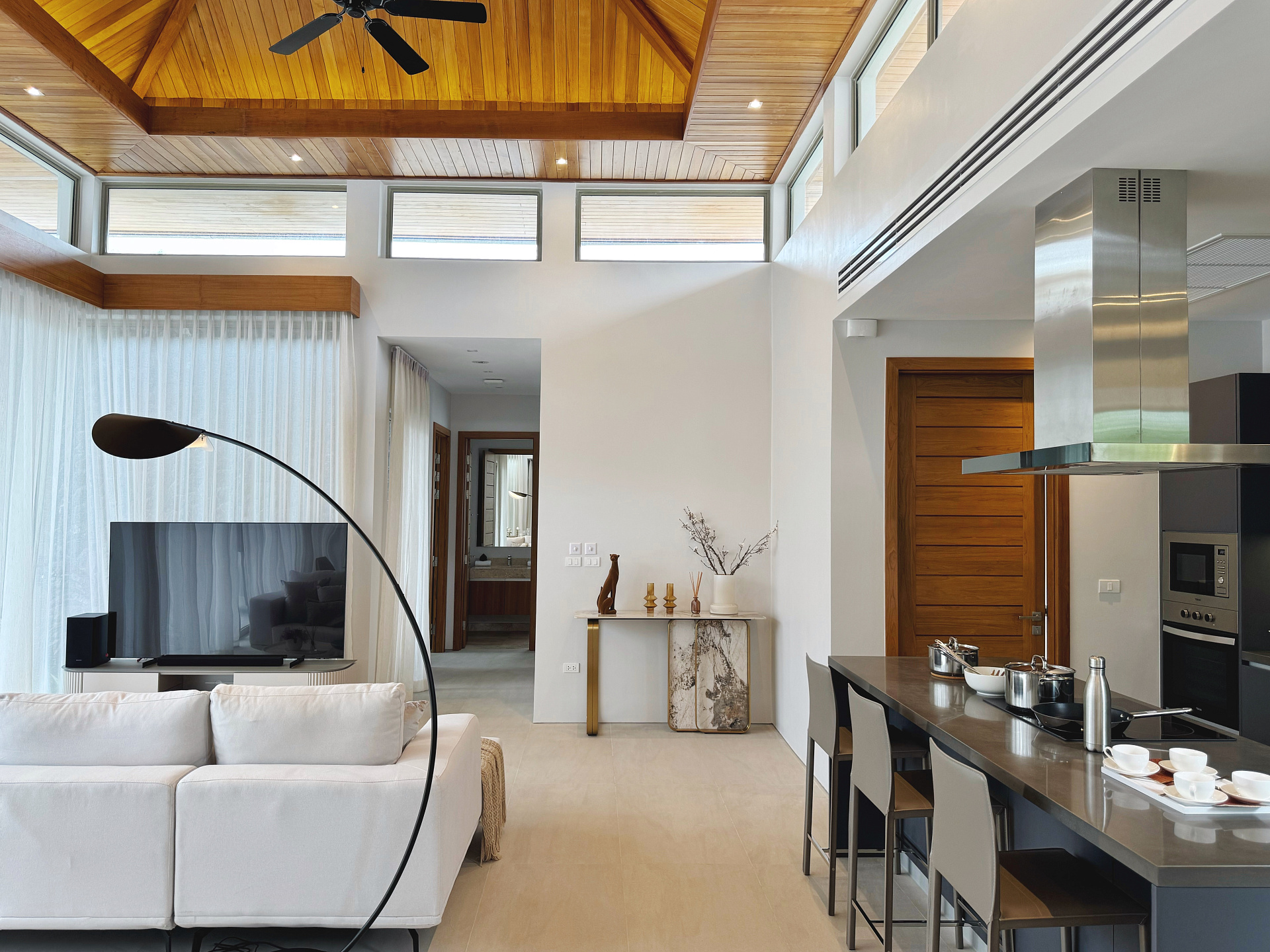 Главное пространство виллы - это просторная гостиная с кухней и обеденной зоной, настоящее сердце дома. Cводчатый потолок из тикового дерева придает элегантный и аутентичный вид, а раздвижные стеклянные двери добавляют света и сияния. В этой же зоне расположены гостевой санузел и постирочная комната.
