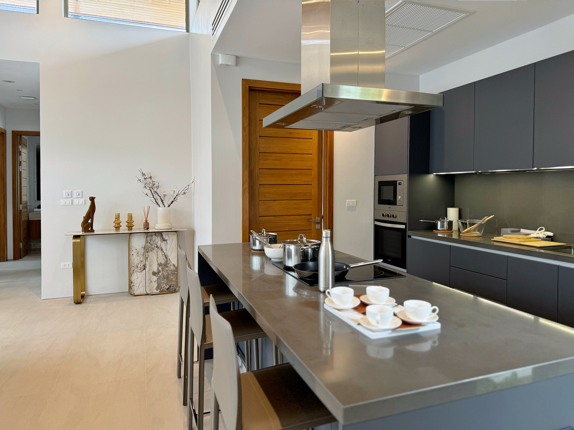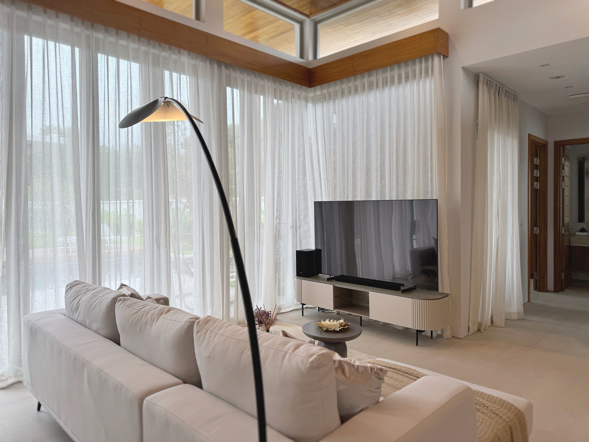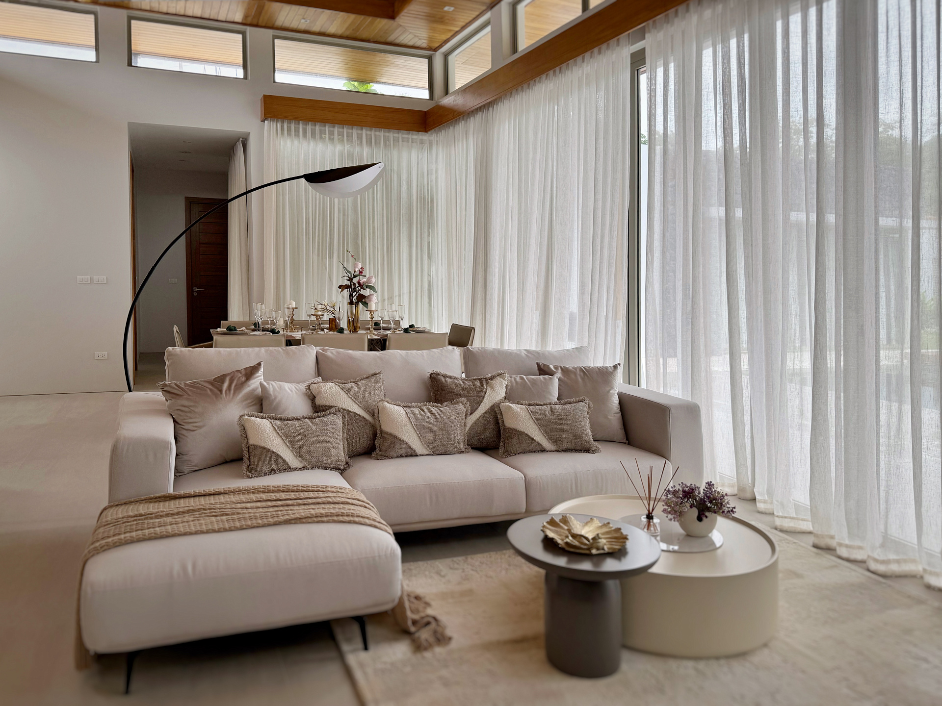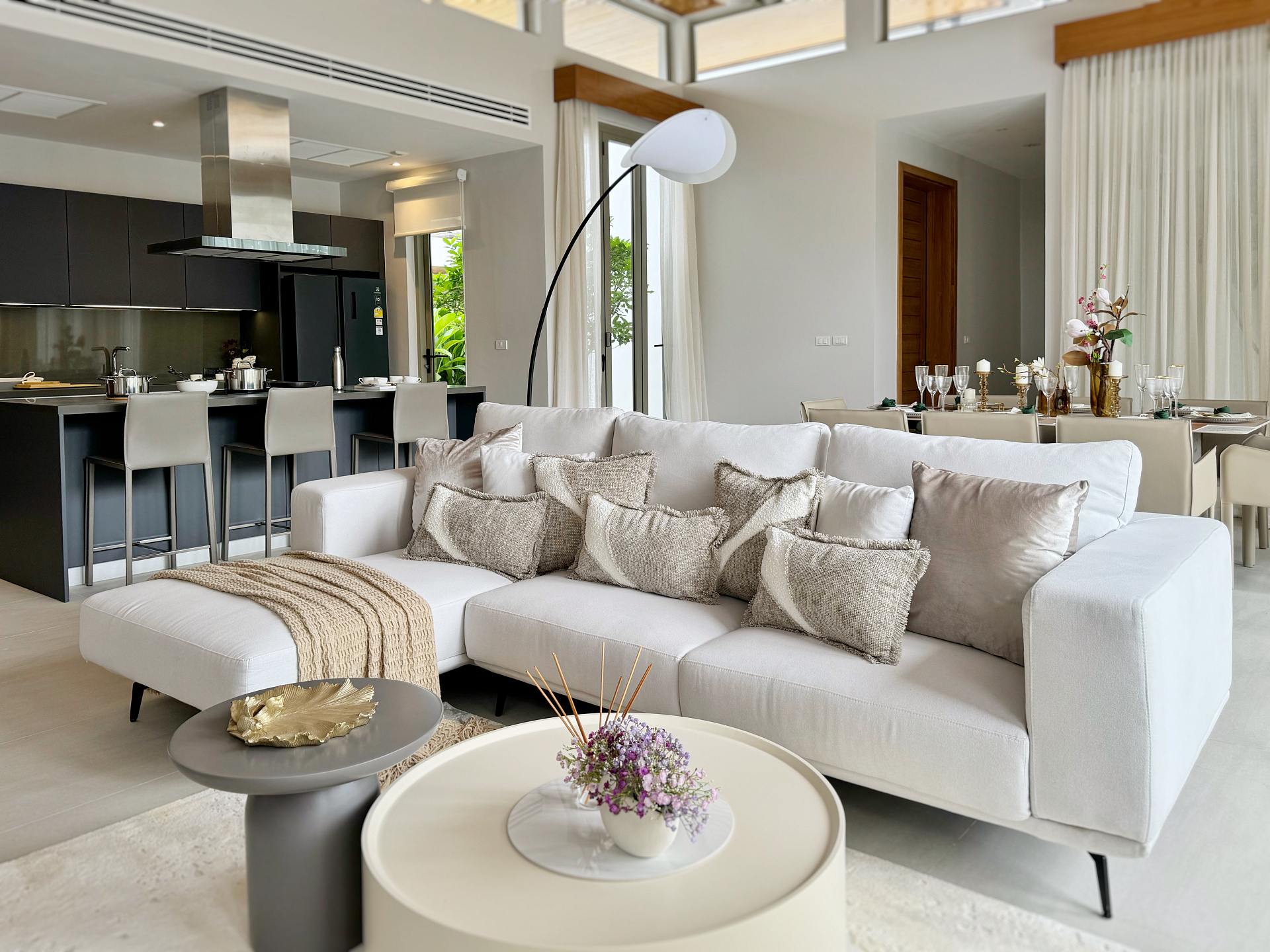 Главное пространство виллы - это просторная гостиная с кухней и обеденной зоной, настоящее сердце дома. Cводчатый потолок из тикового дерева придает элегантный и аутентичный вид, а раздвижные стеклянные двери добавляют света и сияния. В этой же зоне расположены гостевой санузел и постирочная комната.