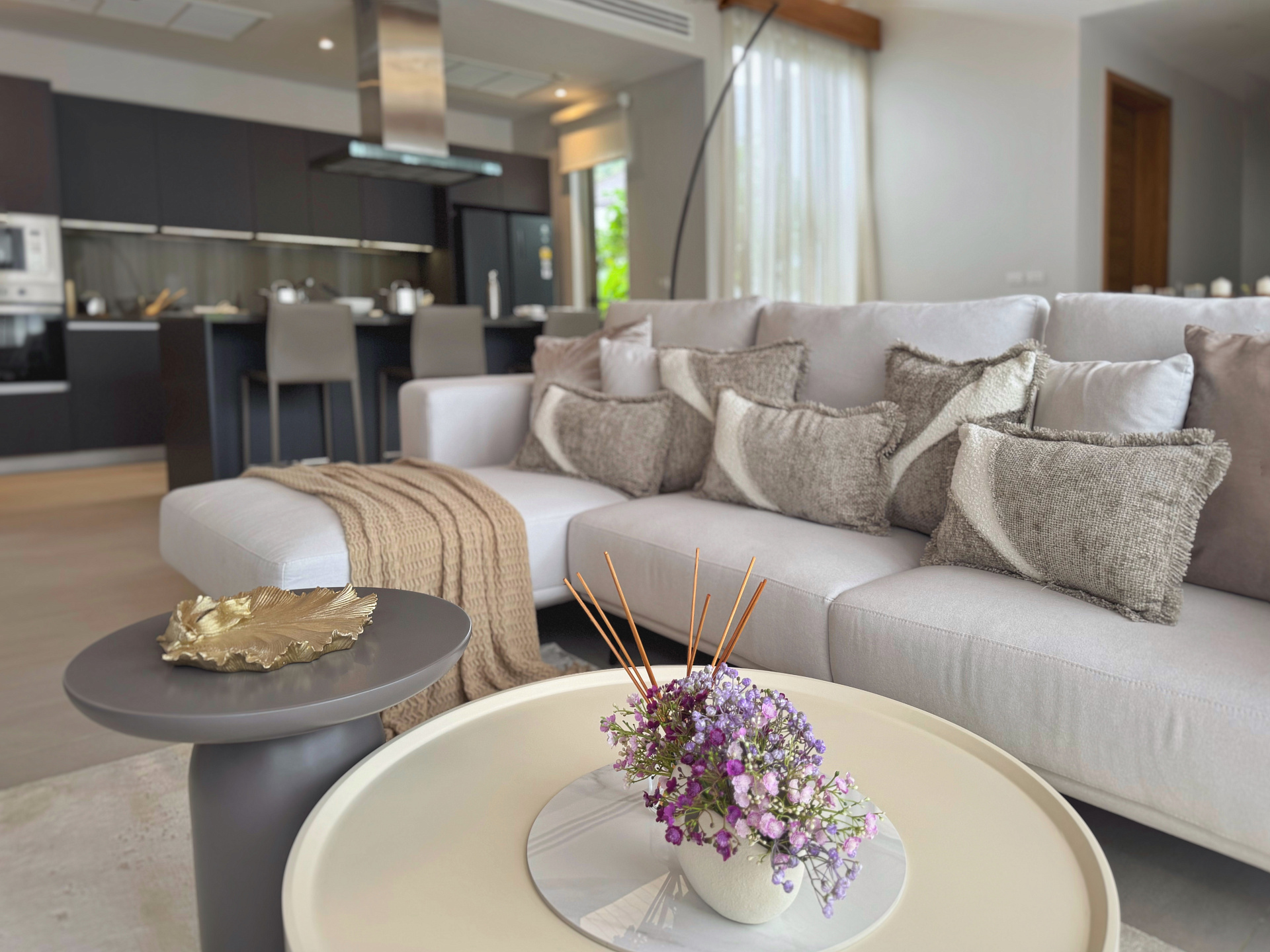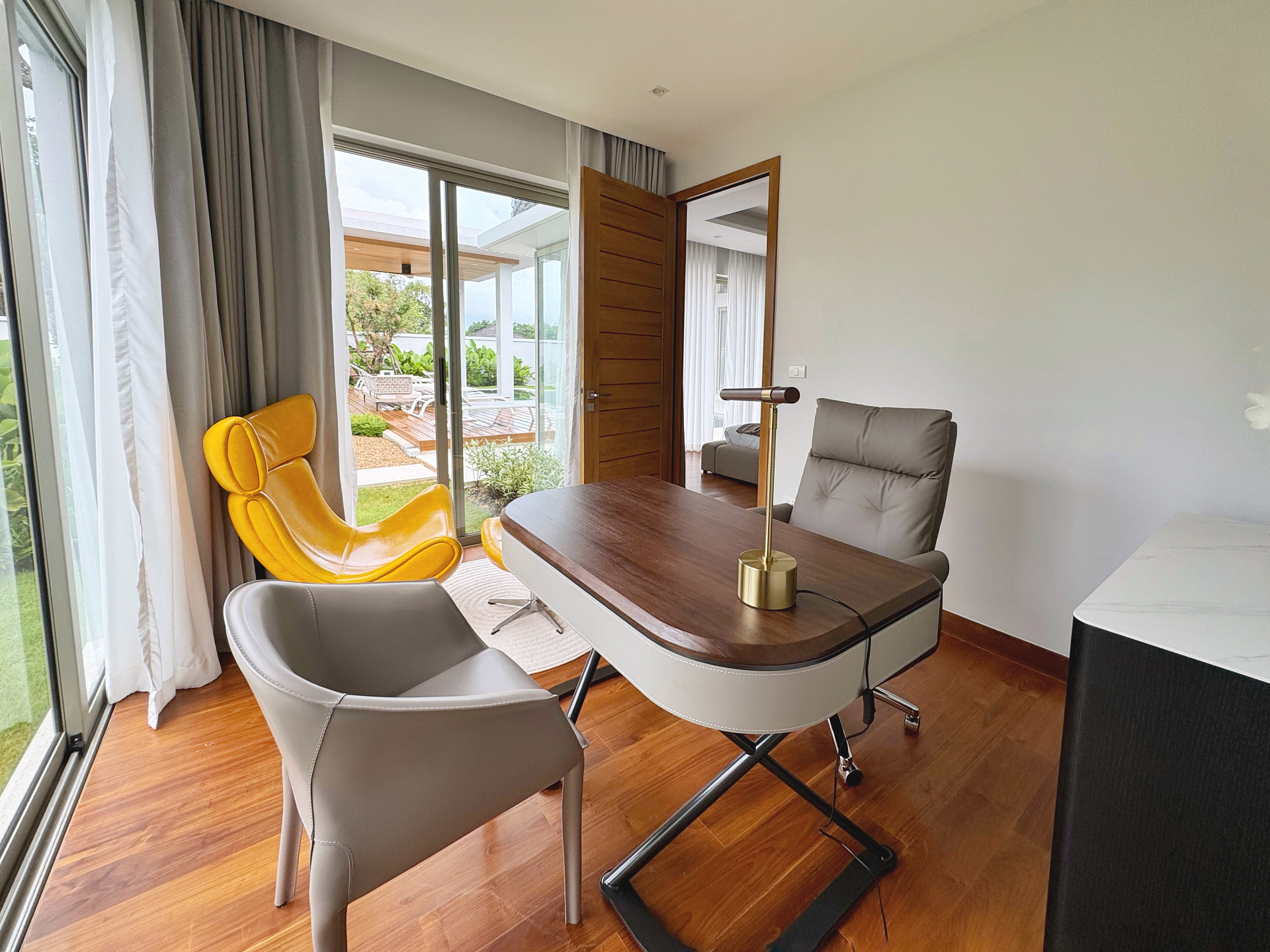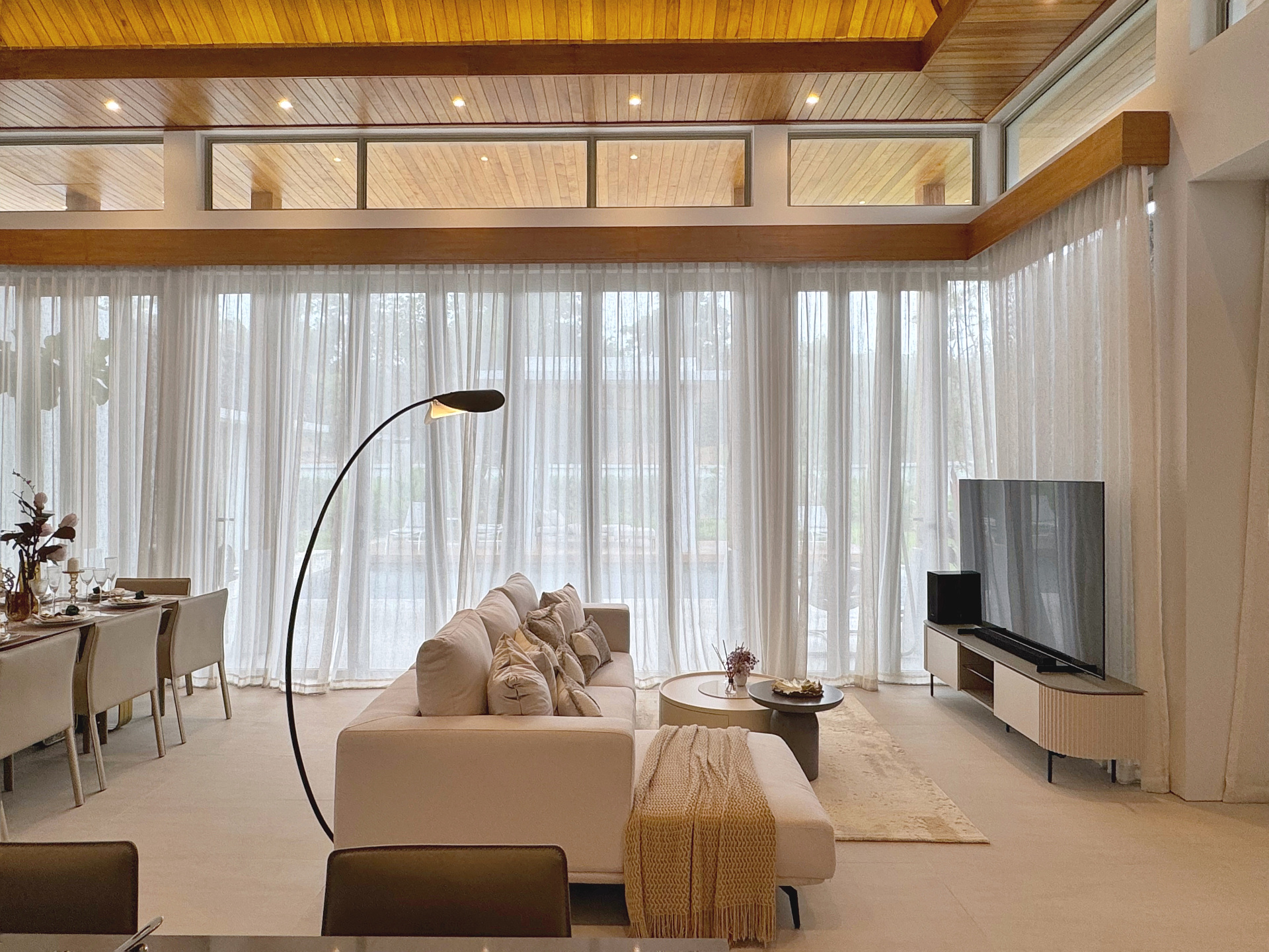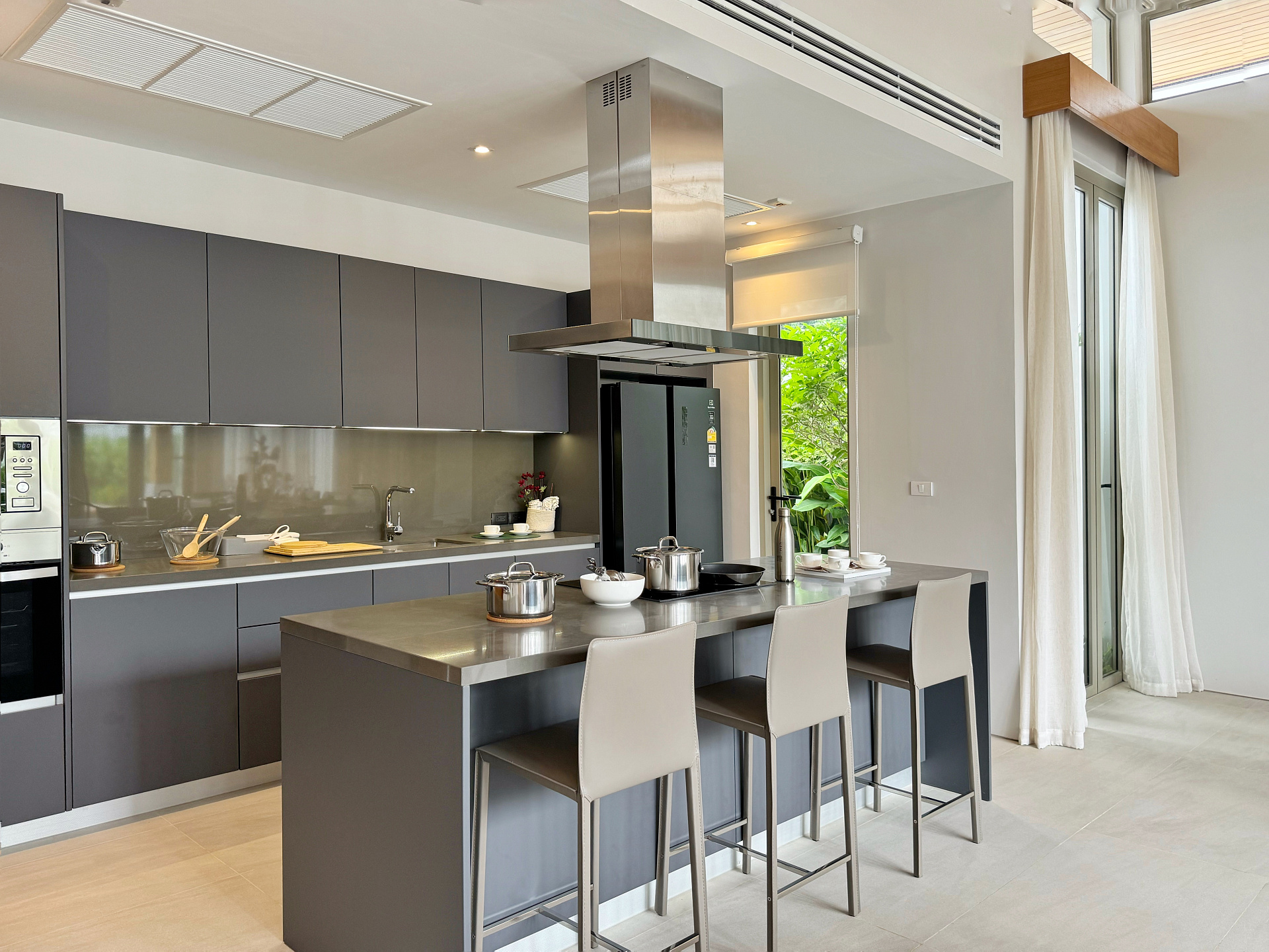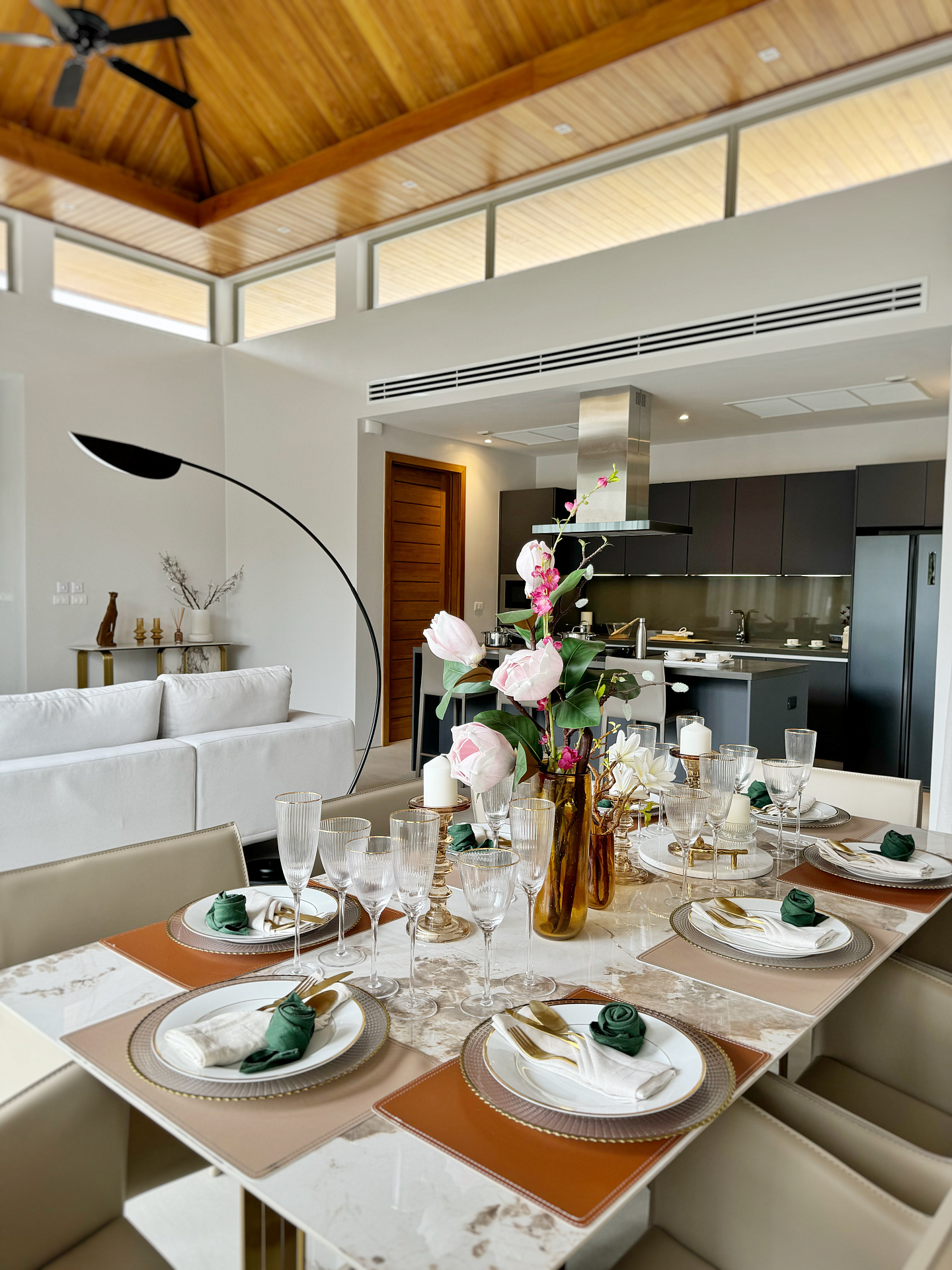Главное пространство виллы - это просторная гостиная с кухней и обеденной зоной, настоящее сердце дома. Cводчатый потолок из тикового дерева придает элегантный и аутентичный вид, а раздвижные стеклянные двери добавляют света и сияния. В этой же зоне расположены гостевой санузел и постирочная комната.