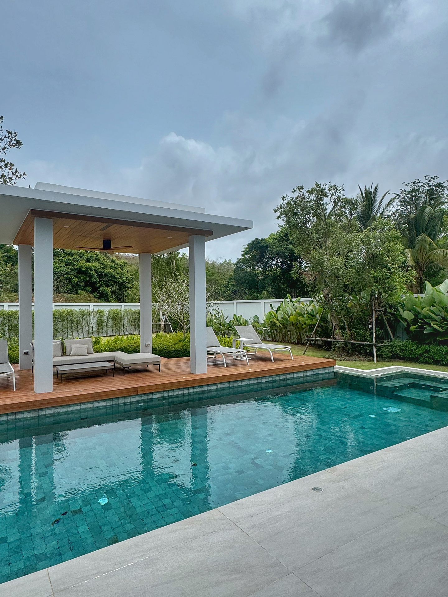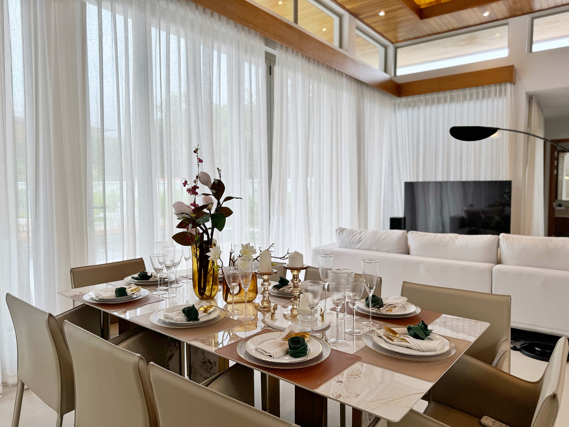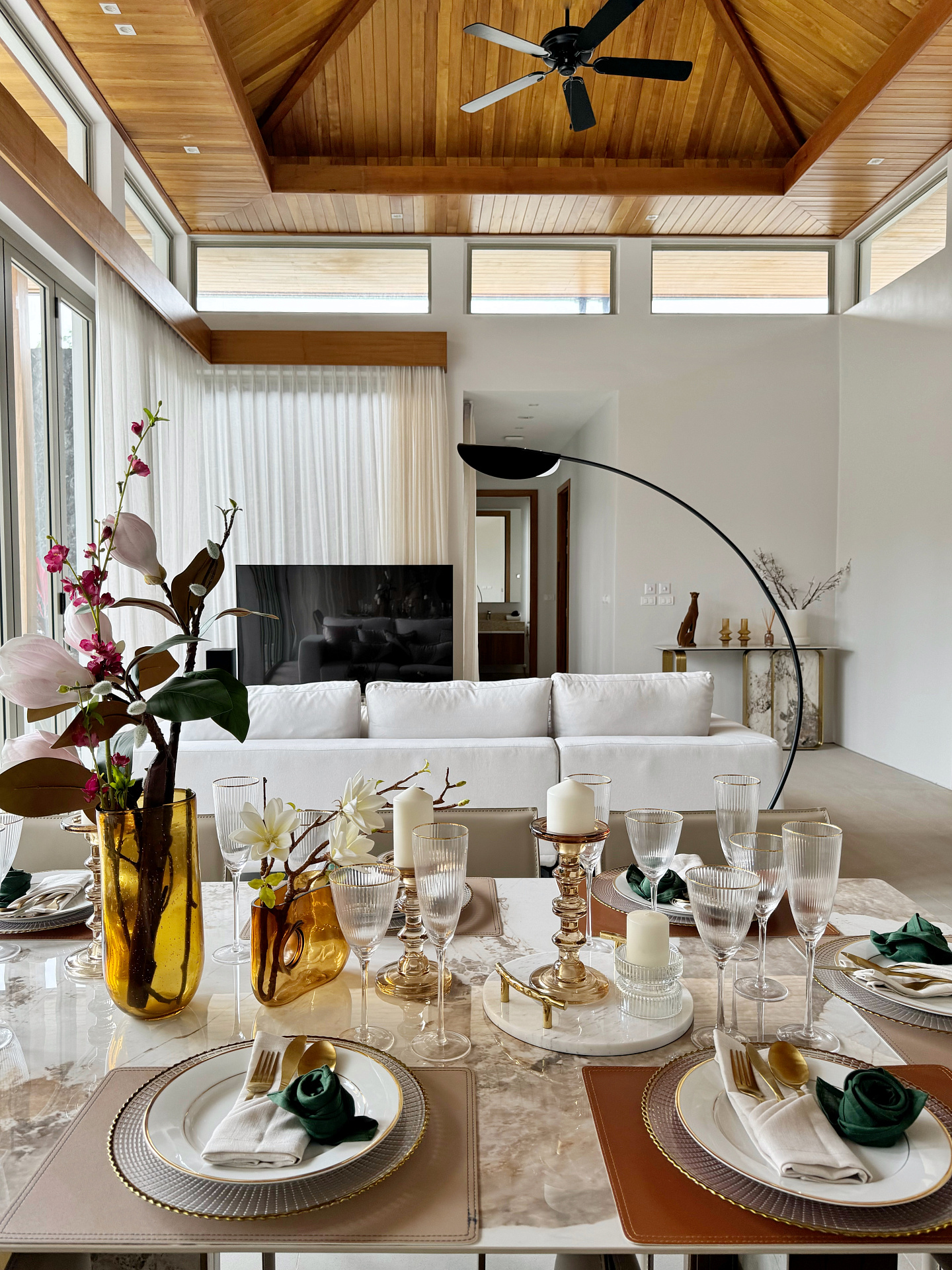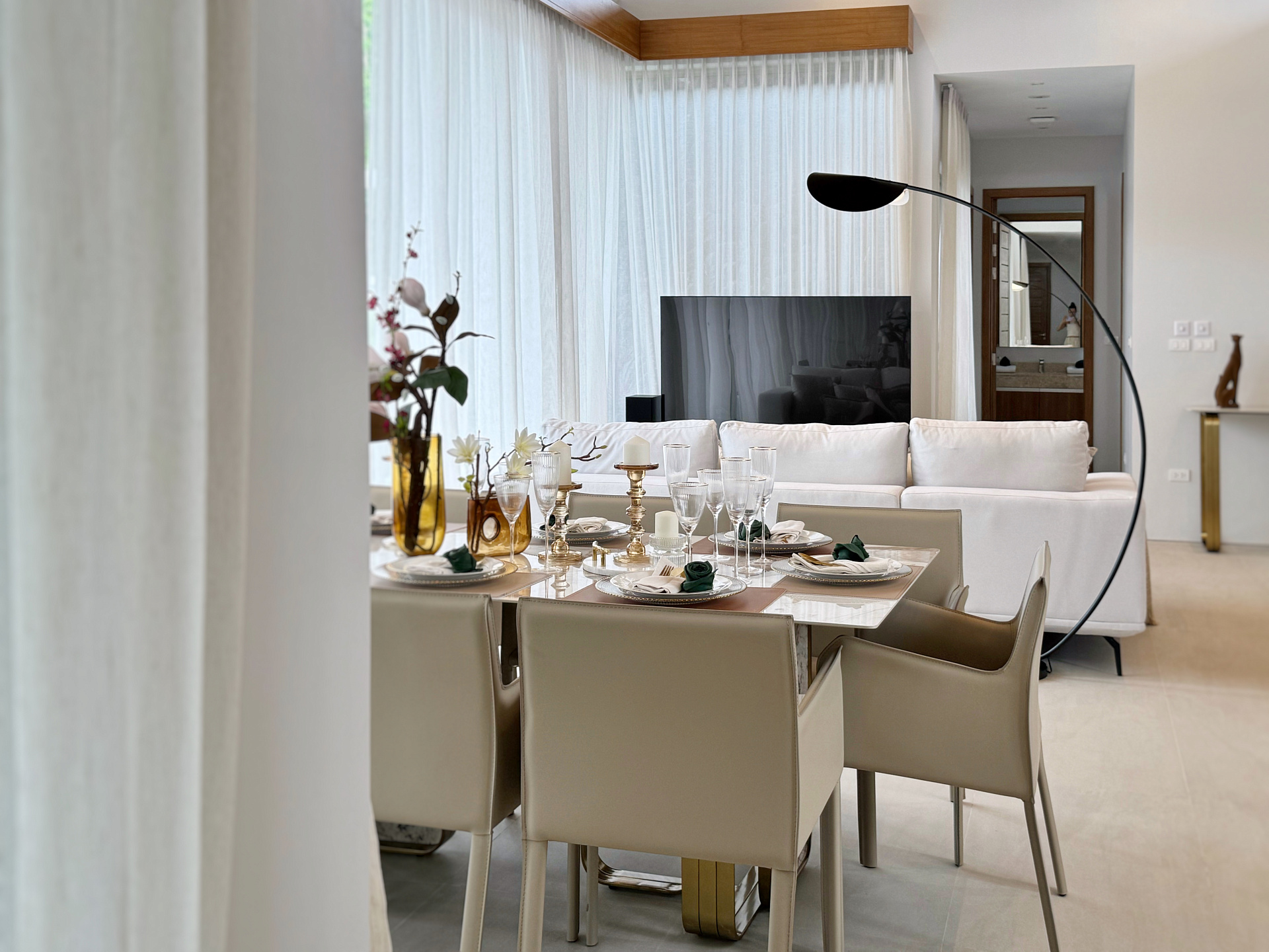 Главное пространство виллы - это просторная гостиная с кухней и обеденной зоной, настоящее сердце дома. Cводчатый потолок из тикового дерева придает элегантный и аутентичный вид, а раздвижные стеклянные двери добавляют света и сияния. В этой же зоне расположены гостевой санузел и постирочная комната.