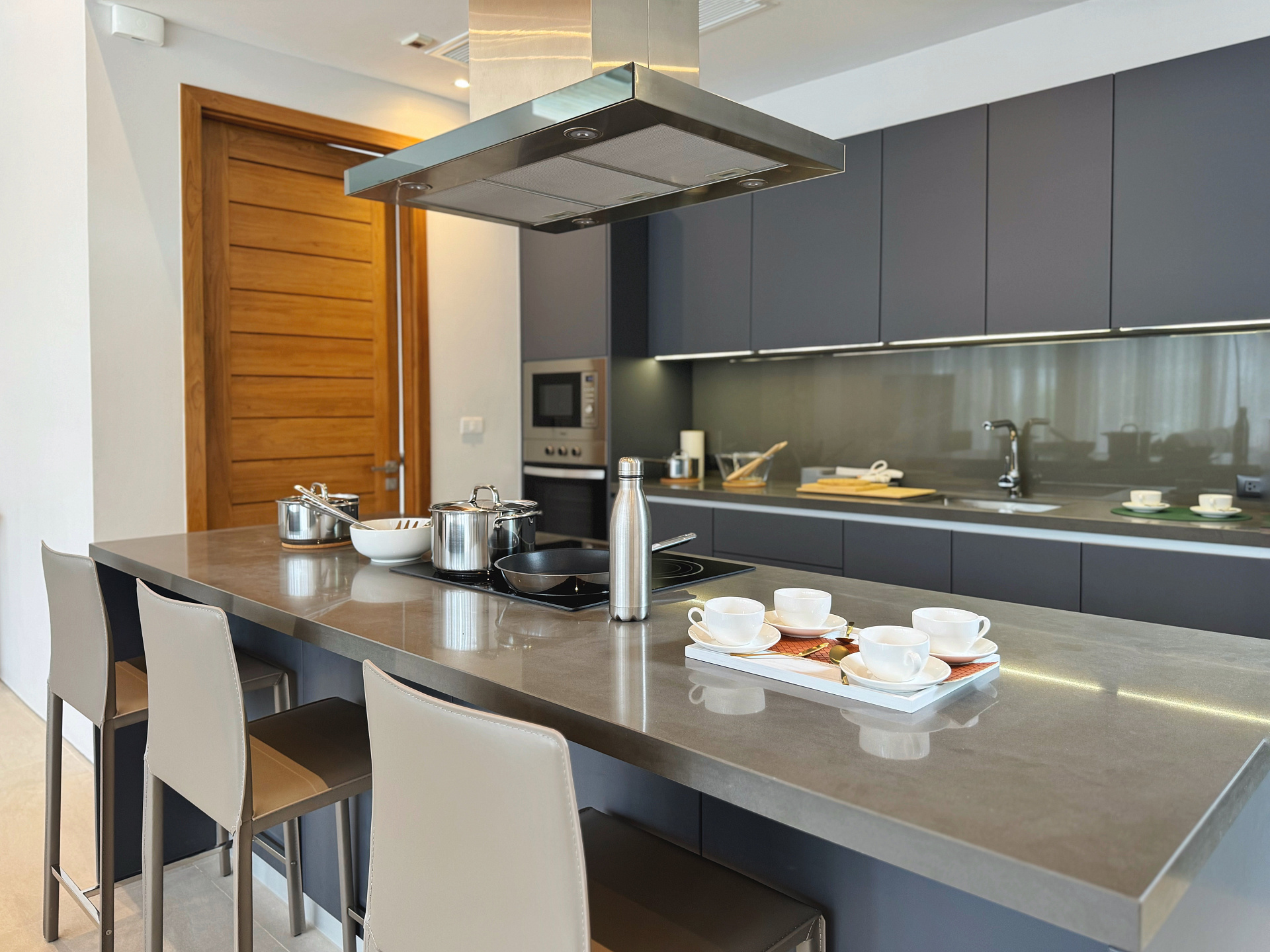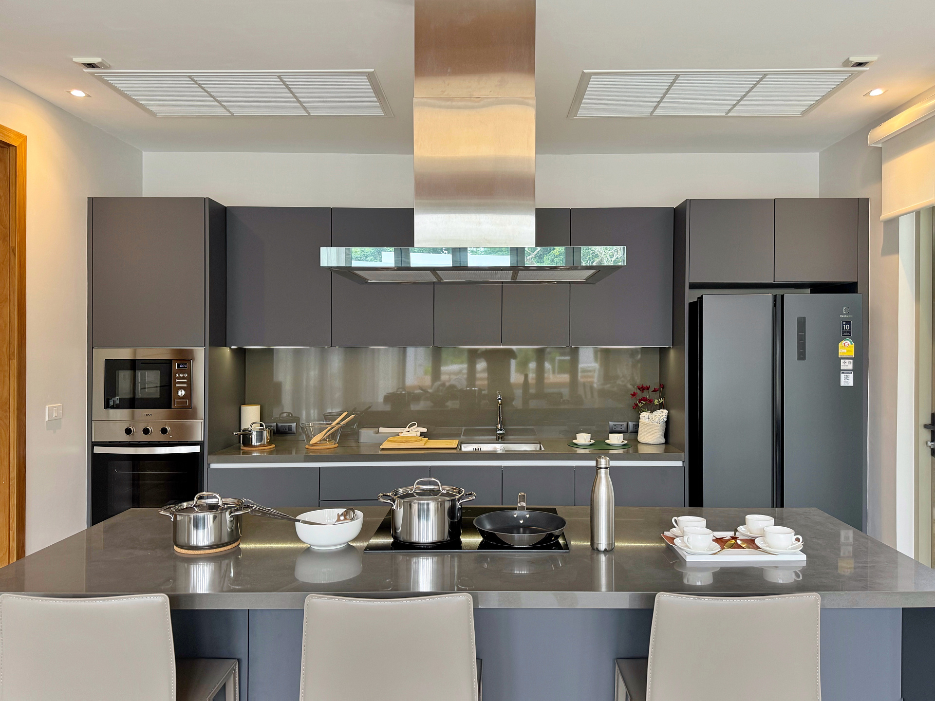 Кухня с просторным островом полностью оборудована современной техникой, включая духовой шкаф и двухкамерный холодильник.