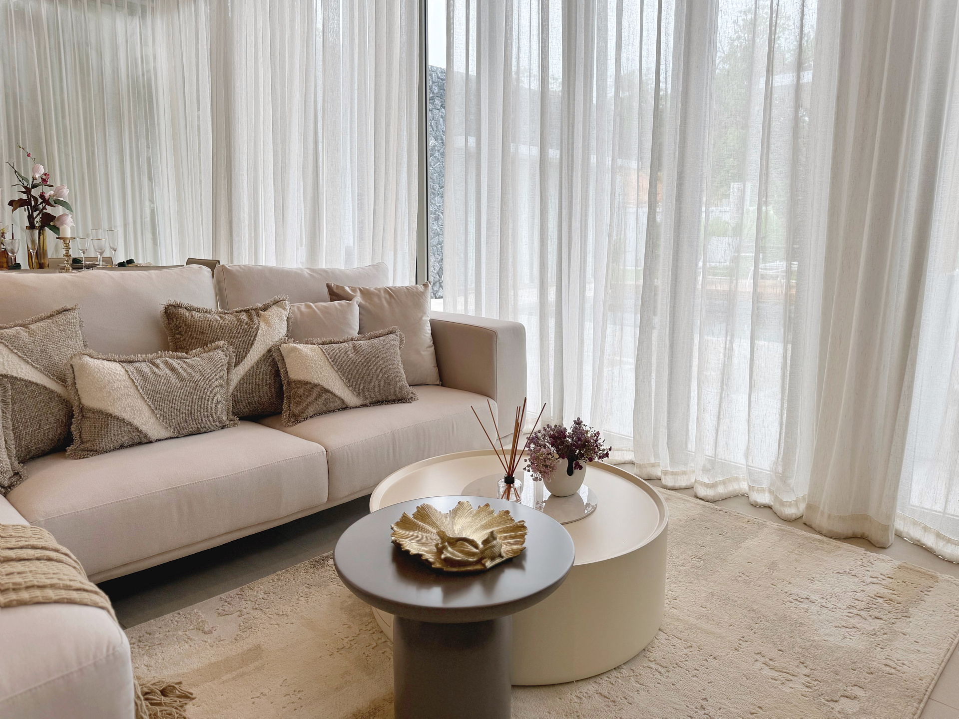 В гостиной расположен большой угловой диван, тв и обеденный гарнитур на 8 персон.