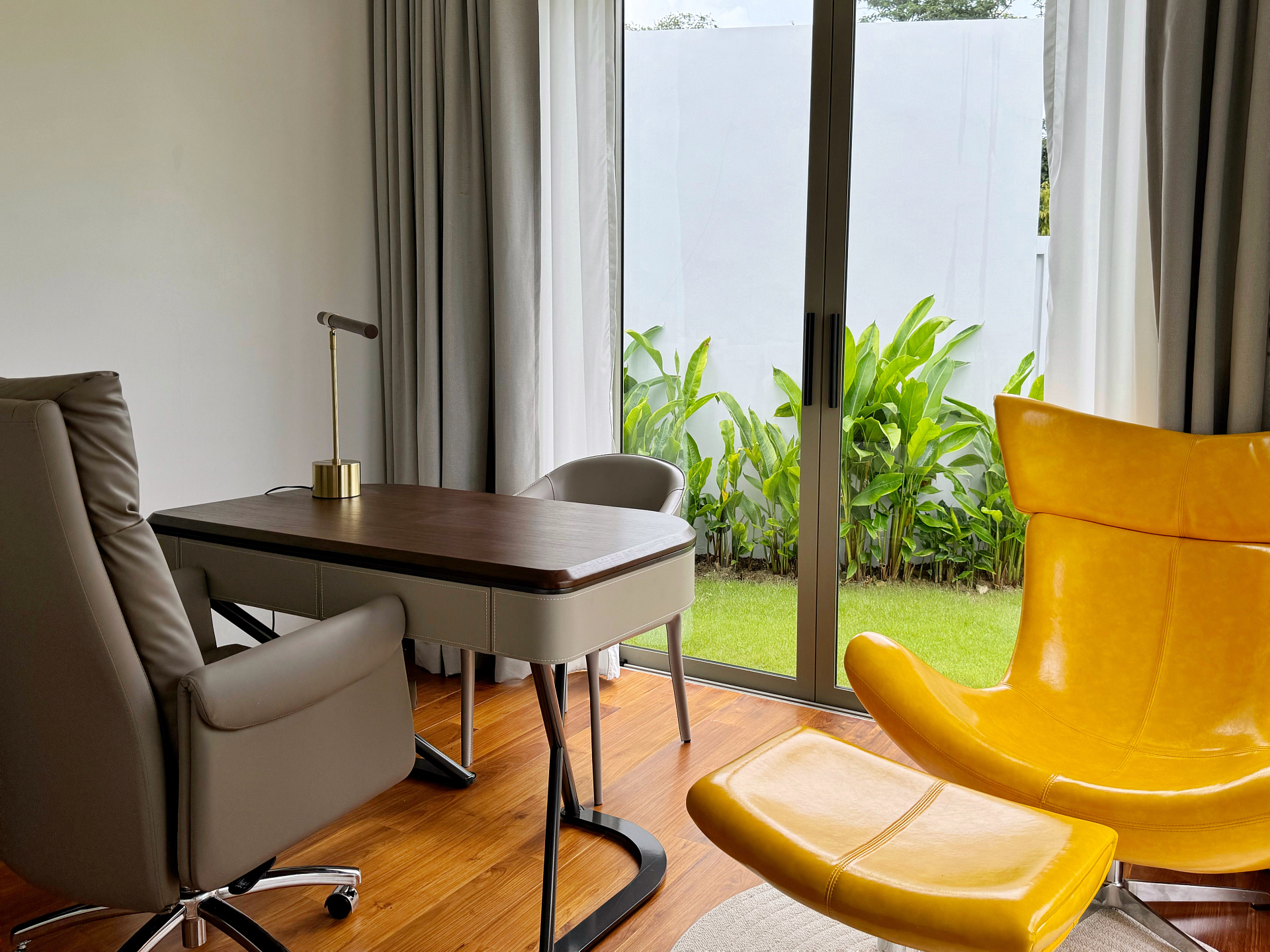 • левое крыло: мастер-спальня с личным кабинетом и просторной ванной комнатой (ванна чаша, душ, двойные умывальники) и 1 гостевая спальня с душевой и туалетом. Из обеих спален предусмотрен выход к бассейну.