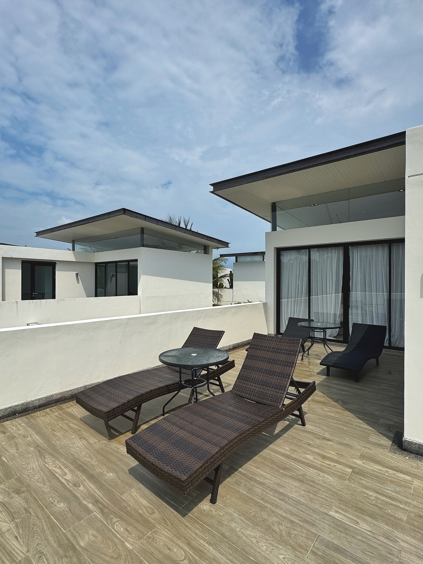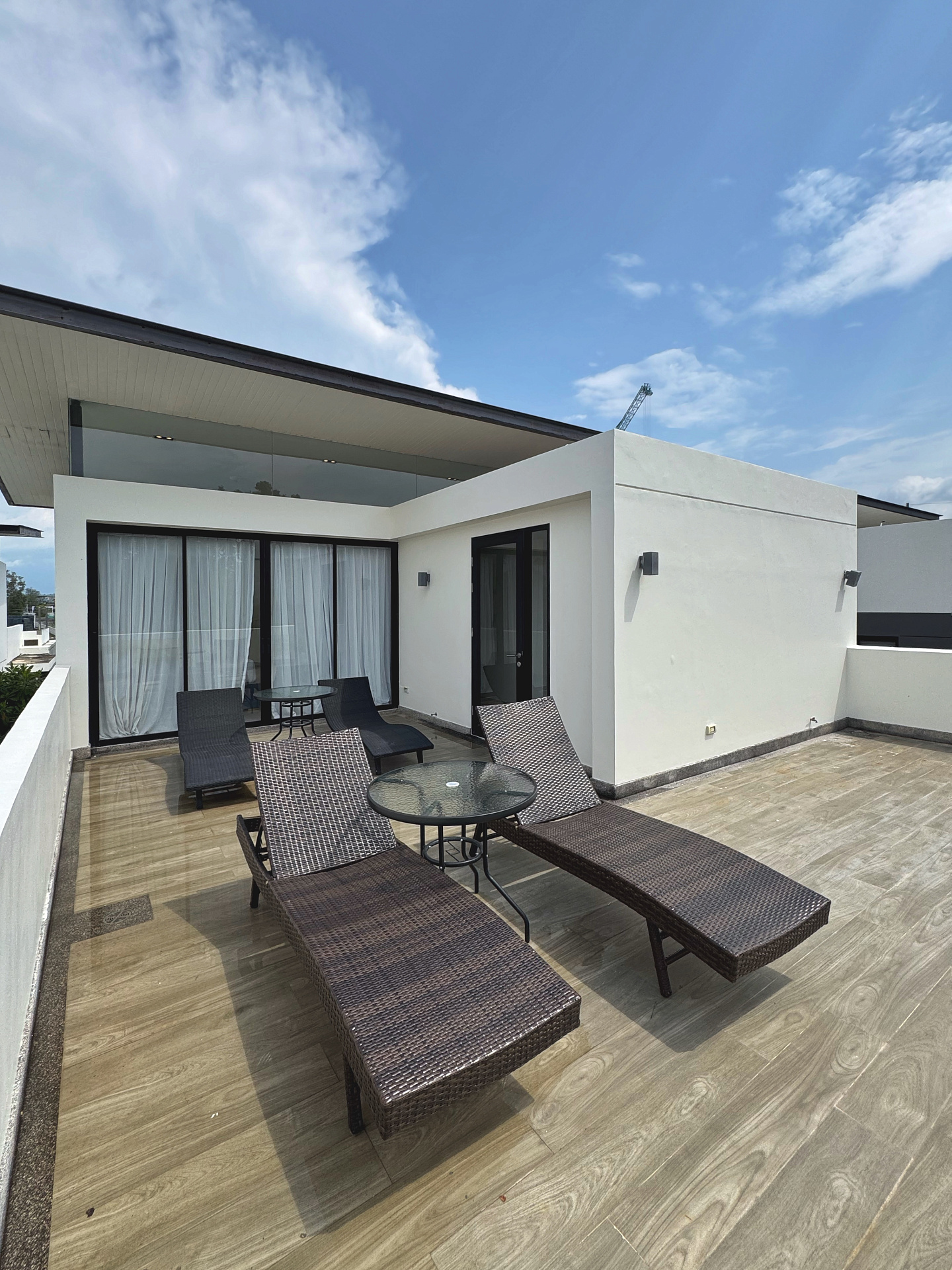 3 этаж: лаунж-зона с диваном и гостевая спальня с выходом на большую террасу с шезлонгами
