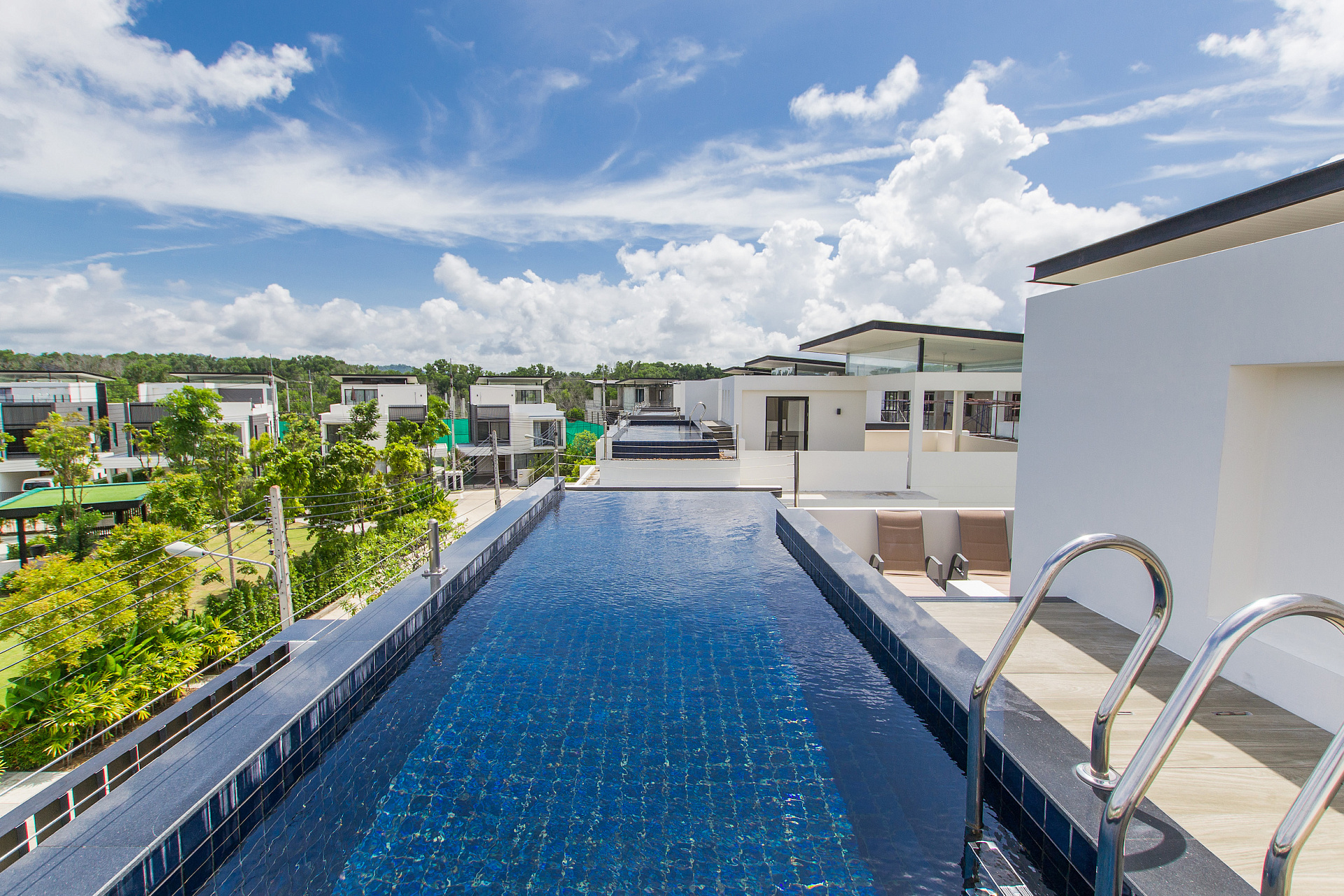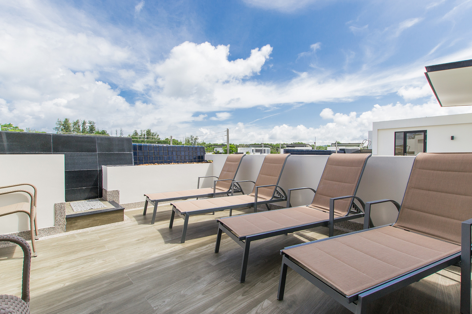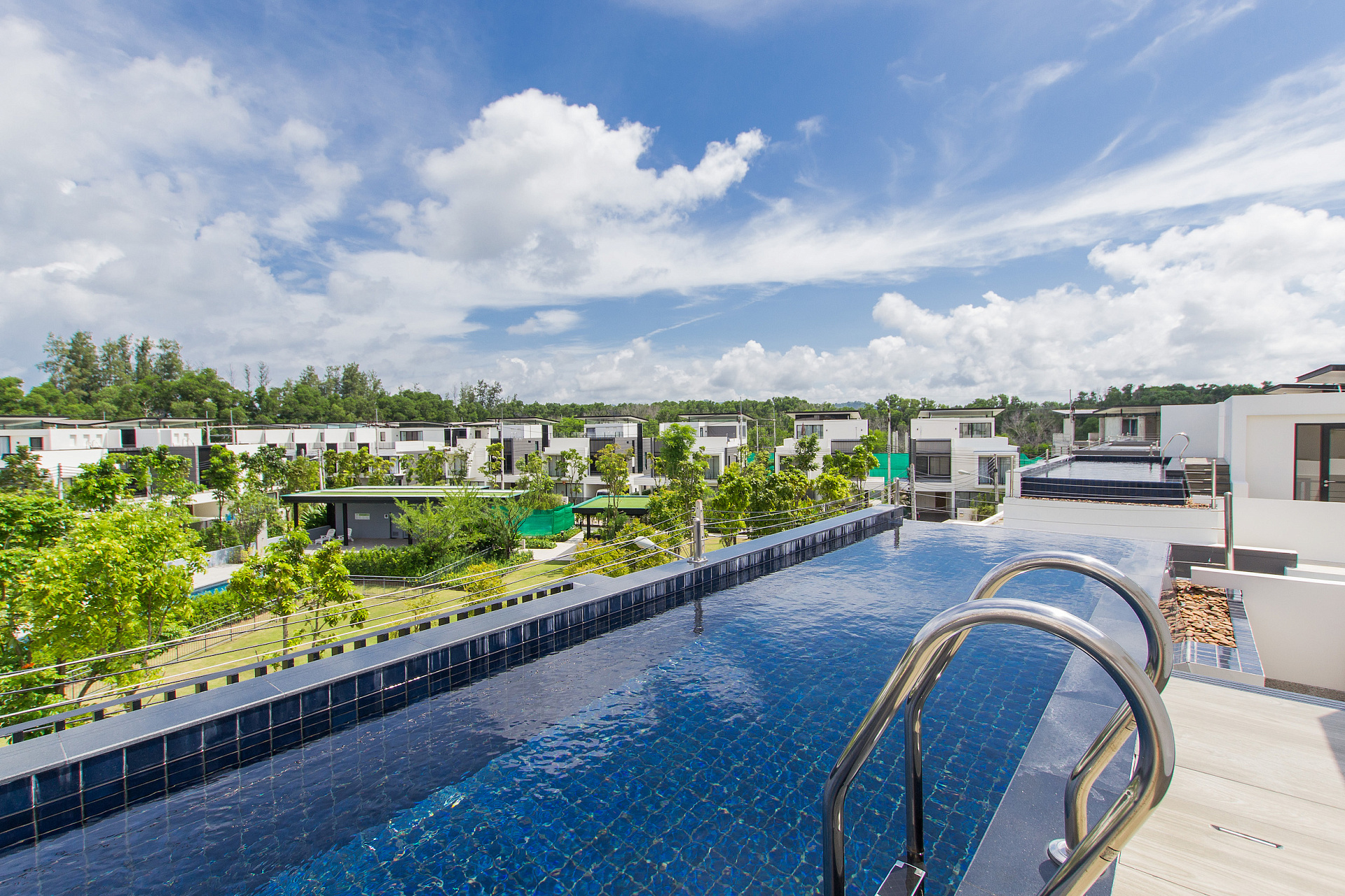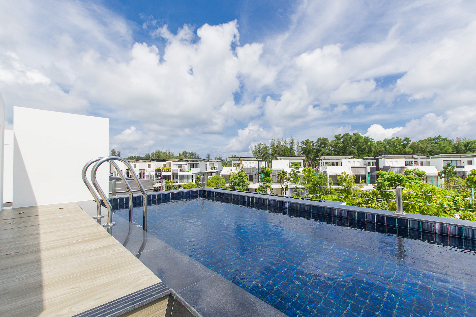 Современная 3-этажная вилла с бассейном и садом. Просторная гостиная с панорамными окнами, полностью оборудованная кухня, 5 уютных спальни с кондиционерами. На крыше – терраса с бассейном и шезлонгами.